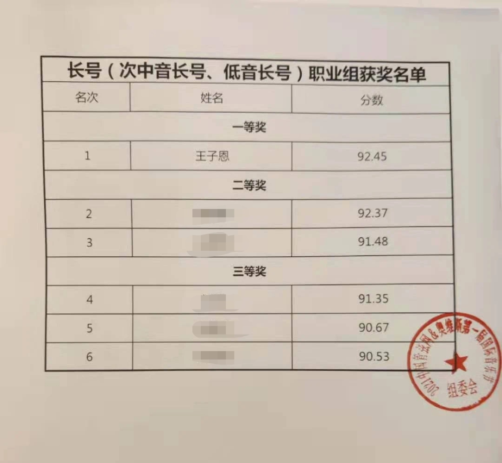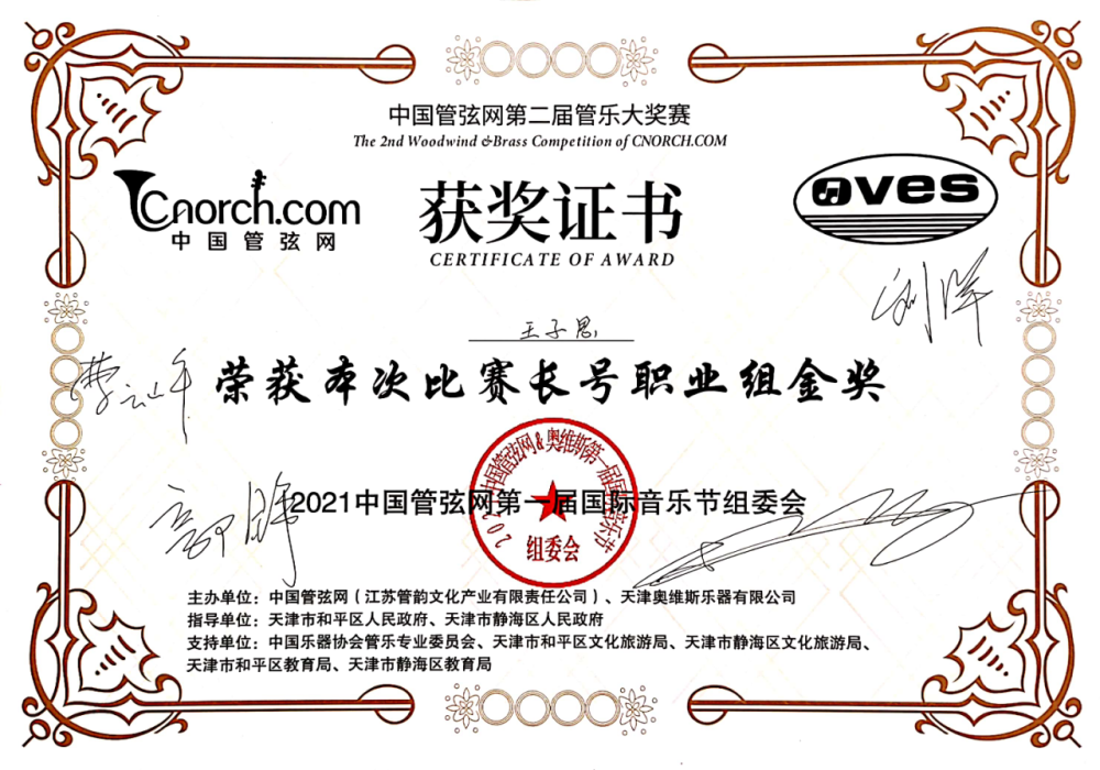 2021年 荣获2021中国管弦网&奥维斯第一届国际音乐节(中国管弦网第二届管乐大奖赛)暨中国第八届国际低音铜管艺术节第四届长号大奖赛长号职业组金奖。