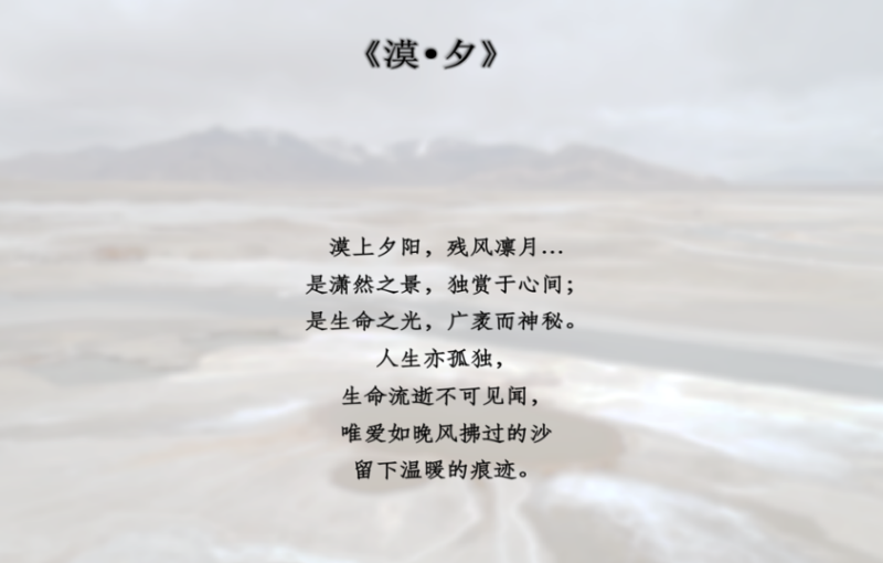 作为开场曲目,《漠·夕》将听众瞬间带入一种深远辽阔的意境当中。作曲家并没有为了炫技而采用过多音色变化的手段,而是在保证纯净音色的基础之上,进行变形与扩声处理。悠悠的琴声,加之细腻的背景音色,其广袤的回响如屡屡烟尘弥散在空旷的戈壁上空。