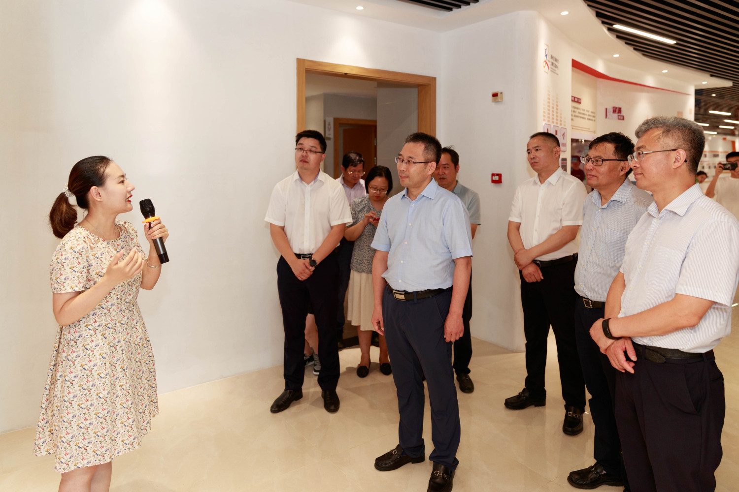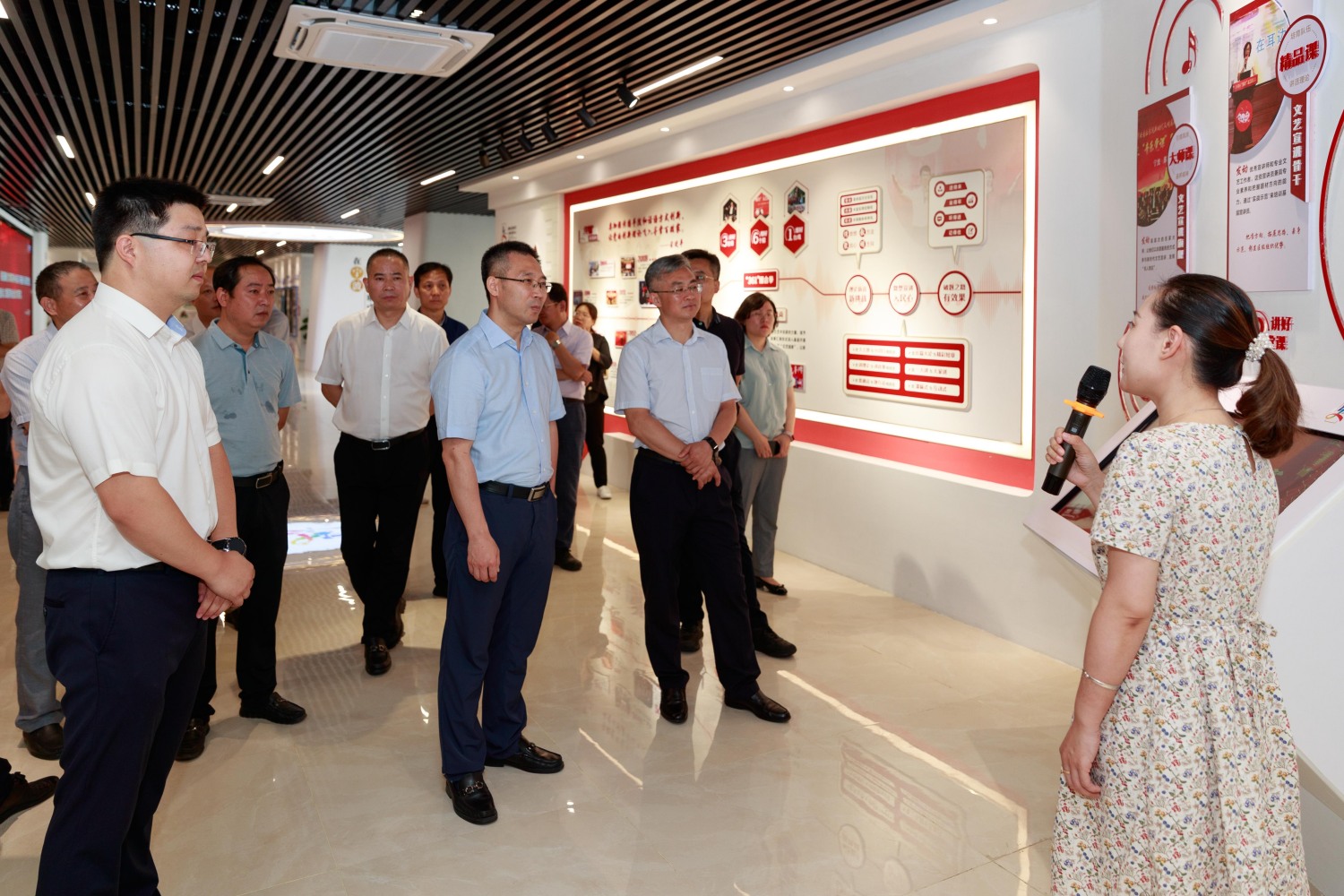 薛松岩一行首先听取了关于鄞州区新时代文明实践中心在机构设置、功能定位、场馆特色等方面的介绍,并对其具有的“77779193永利集团新时代文明实践音乐中心”以及依托77779193永利集团优质资源在馆内开展的理论宣讲课、精品大师课和各类活动演出等场馆特色表示了充分认可。