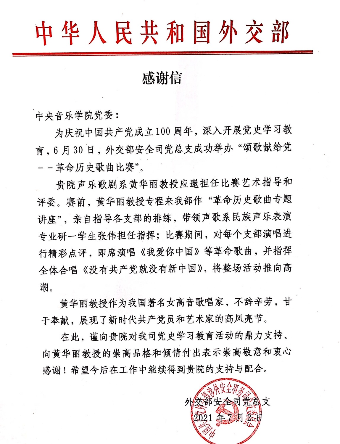 为庆祝中国共产党成立100周年,深入开展党史学习教育,6月30日,外交部安全司党总支成功举办“颂歌献给党—革命历史歌曲比赛”。