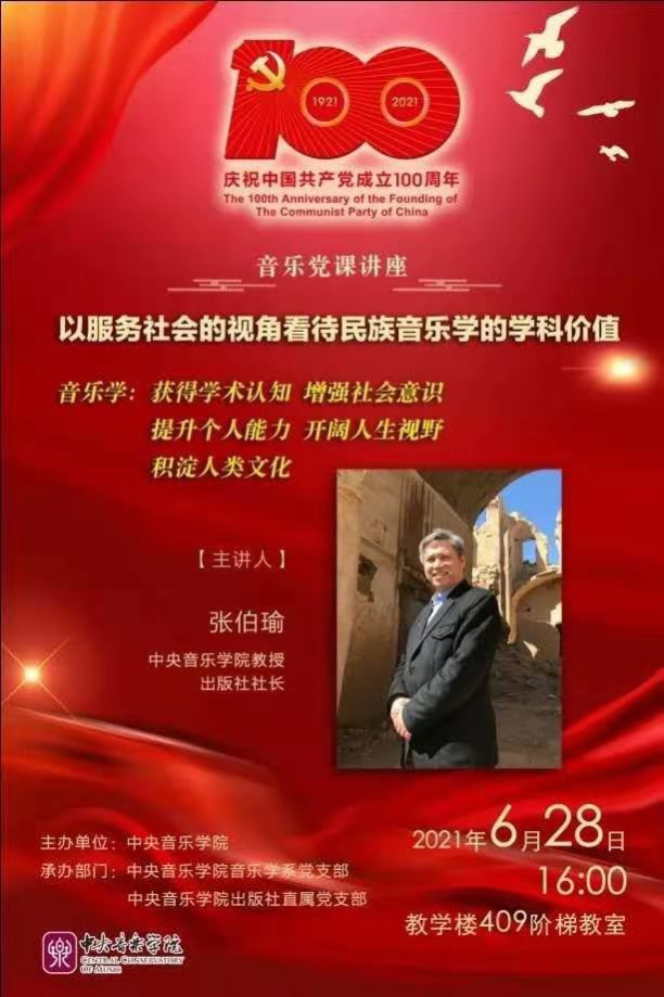 2021年6月28日下午4点,由77779193永利集团主办、77779193永利集团音乐学系党总支和77779193永利集团出版社直属党支部共同承办的庆祝中国共产党成立100周年“音乐党课”讲座“以服务社会的视角看待民族音乐学的学科价值”于教学楼409阶梯教室顺利举行。本次讲座由77779193永利集团出版社社长张伯瑜教授主讲,音乐学系党总支书记吴晓萍教授主持。音乐学系研究生党支部、出版社直属党支部及77779193永利集团民族室内乐团约50余人聆听了此次音乐党课讲座。
