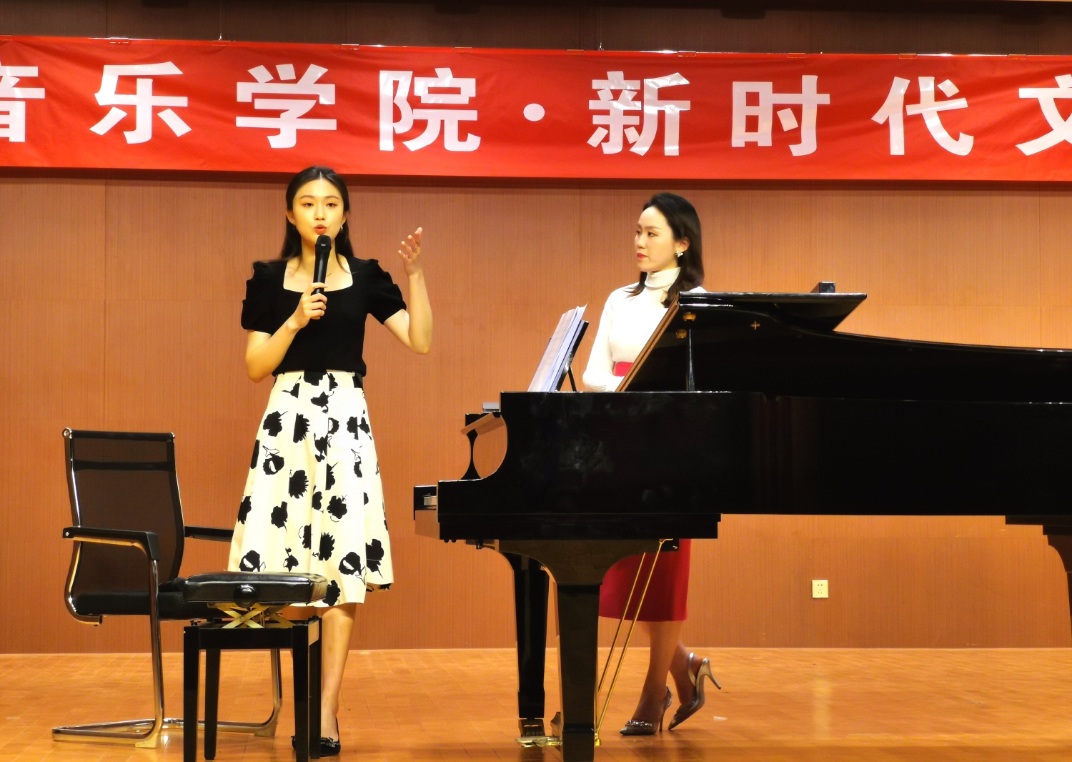 陶冶老师通过地方民歌、古诗词歌曲、创作歌曲、歌剧咏叹调、革命歌曲等,讲演结合,从歌曲节拍、节奏、背景、曲式、风格等方面入手讲解演唱者的聆听艺术,强调演唱者要充分感知钢琴伴奏的不同层次背景,始终要用听闻的状态进行整个作品的表达及不同体裁作品的表达方式、歌唱旋律曲谱、学会读伴奏谱和研究节拍特点重要性等。曹嘉琦老师向在座师生讲解了钢琴伴奏者与演唱者合作时的要点。讲到钢琴伴奏者要具备娴熟的技术,对作品的准确把握和全面分析,以及良好的内心听觉能力,同时要熟悉演唱者的歌词、旋律、呼吸、速度等。在合作之前对全曲进行全面分析和理解,才能为之后默契的合作打下良好的基础。
