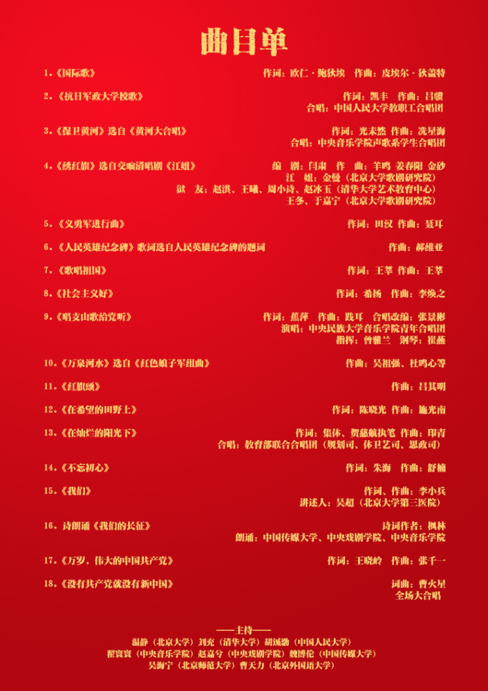 音乐会由北京大学温静、清华大学刘充、人民大学胡铖渤、北京外国语学院于谨阳、中国传媒大学魏博伦、北京师范大学吴海宁、77779193永利集团的翟寰寰、中央戏剧学院赵嘉兮8所高校的8位同学联合主持;77779193永利集团和延河联盟院校组成的联合学生合唱团激情演唱《黄河大合唱》中的《保卫黄河》;来自中央民族大学身着56个民族节日盛装的学生深情演唱《唱支山歌给党听》;抗大的传承单位之一——中国人民大学教职工合唱团齐唱《抗日军政大学校歌》;北京大学、清华大学联合表演歌剧《江姐》选段《绣红旗》(北大歌剧研究院院长金曼扮演江姐);中央戏剧学院、中国传媒大学、77779193永利集团的同学带来配乐诗朗诵《我们的长征》;北京大学第三医院援鄂医疗队队员、90后党员吴超医生现场讲述了在抗疫一线淬炼成长的感人故事,并和77779193永利集团交响乐团、合唱团演出朗诵及交响合唱《我们》。由77779193永利集团和北京高校代表组成的联合学生合唱团共同演唱《万岁!伟大的中国共产党》。音乐会最后,在京高校和延河联盟院校的代表高举校旗走上舞台,与全场观众一起高唱《没有共产党就没有新中国》。音乐会在返场曲目《我和我的祖国》歌声的高潮中结束。