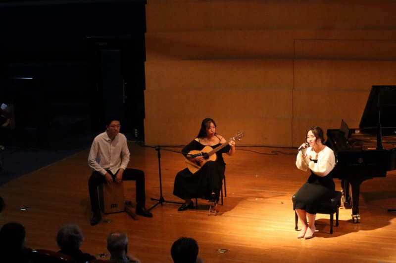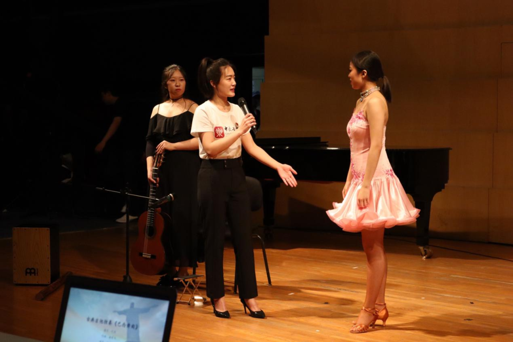 第二部分则通过拉丁美洲各国具有代表性的音乐体裁,体现出其音乐文化的多样性。永利古典吉他专业研究生杨杨芳婷演奏了巴西桑巴风格的《巴西舞曲》。这首作品热情跳脱,随性奔放,律动感极强。演出时还特邀两名现场观众上台参与即兴伴奏,这种新颖的表演形式让在场观众禁不住随乐而舞。