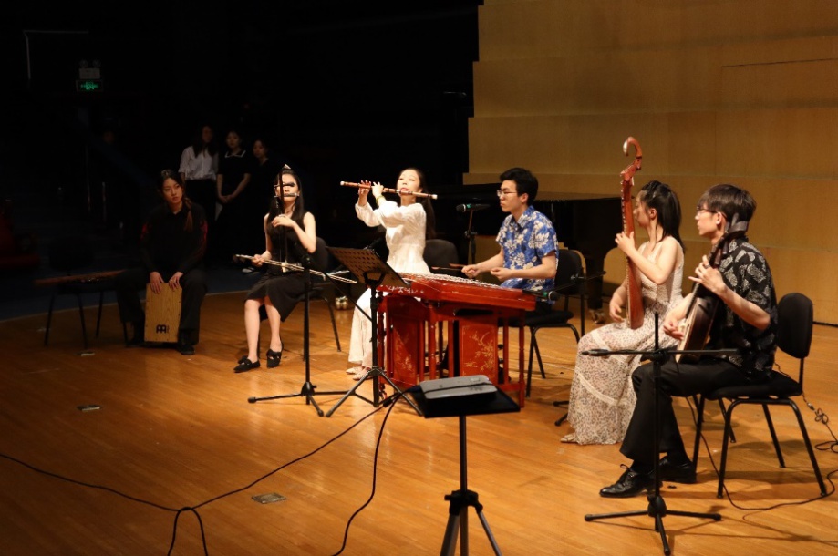 本场音乐会演出的第一部分通过青年扬琴演奏家陈芸芸改编自秘鲁音乐的两首作品《我的秘鲁》《太阳圣女》,去探寻秘鲁音乐与东方文化的神秘渊源。主讲人简要阐释了印第安人音乐与中国音乐擅用五声音阶的相似性,追溯了印第安人与东方人种的渊源关系。两首乐曲极富叙事性,旋律悠扬欢快,以俏皮的中国竹笛代替秘鲁特色乐器盖那竖笛,别具一格。卡洪鼓与扬琴富于动力的节奏材料,又使乐曲独具异域色彩。作品另加入雨声筒这一特别的打击乐器,丰富了音乐的想象空间。