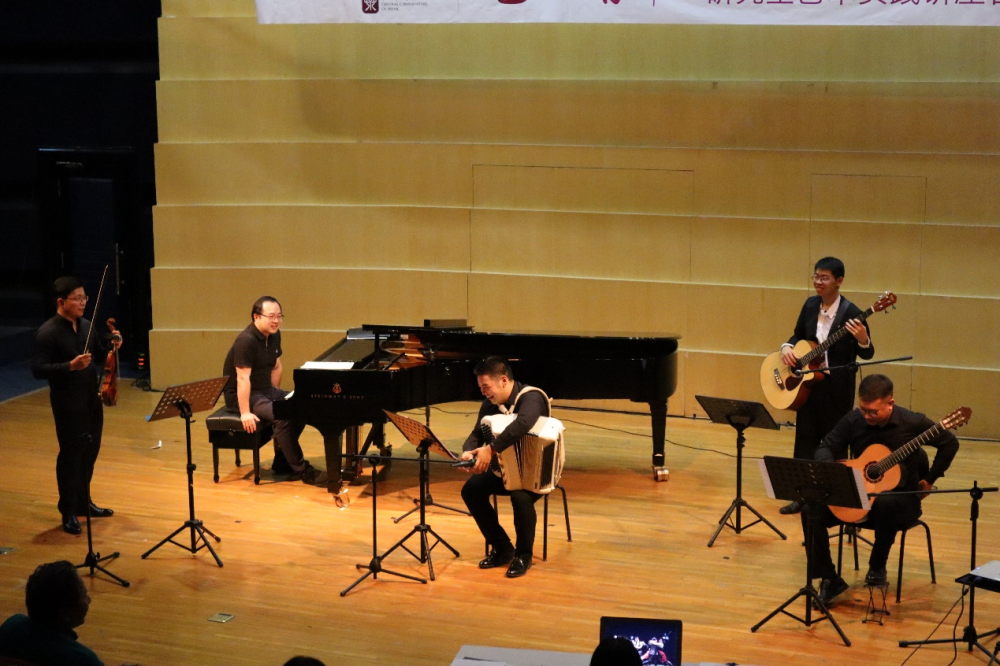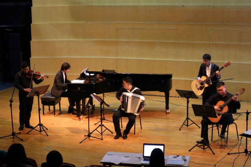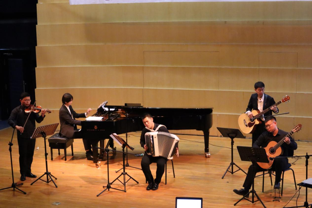 探戈音乐专场演出由“和合室内乐团”(许可卿、麦天龙、石岳、刘明泽、王超杰)完成,该乐团以其独有的风格和魅力活跃于国内外各知名舞台。他们首先表演了皮亚佐拉创作的五首作品:《暴怒探戈》《春》《冬》《再见诺尼诺》《角鲨》,随后演绎我国作曲家创编的两首作品:《花之探戈》《探个够》。通过皮亚佐拉的探戈作品以及中国作曲家创作的探戈作品,进一步展现出中阿两国在音乐文化上的交融与对话。