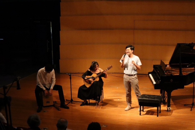音乐会开场,主讲人米炫晔简要回顾了在中国共产党的领导下我国与拉丁美洲国家的外交历程及文化渊源,并邀请陈自明教授介绍了永利音乐学系世界民族音乐教研室关于拉丁美洲音乐研究的相关成就。陈教授从拉丁美洲音乐文化的宏观特征及已有的拉丁美洲学术成果两方面出发,指出中国音乐与拉丁美洲音乐文化有着千丝万缕的亲缘关系。随后,音乐会正式开始,整场作品从三个层面展现出中国与世界、交流与融合的文化发展过程。
