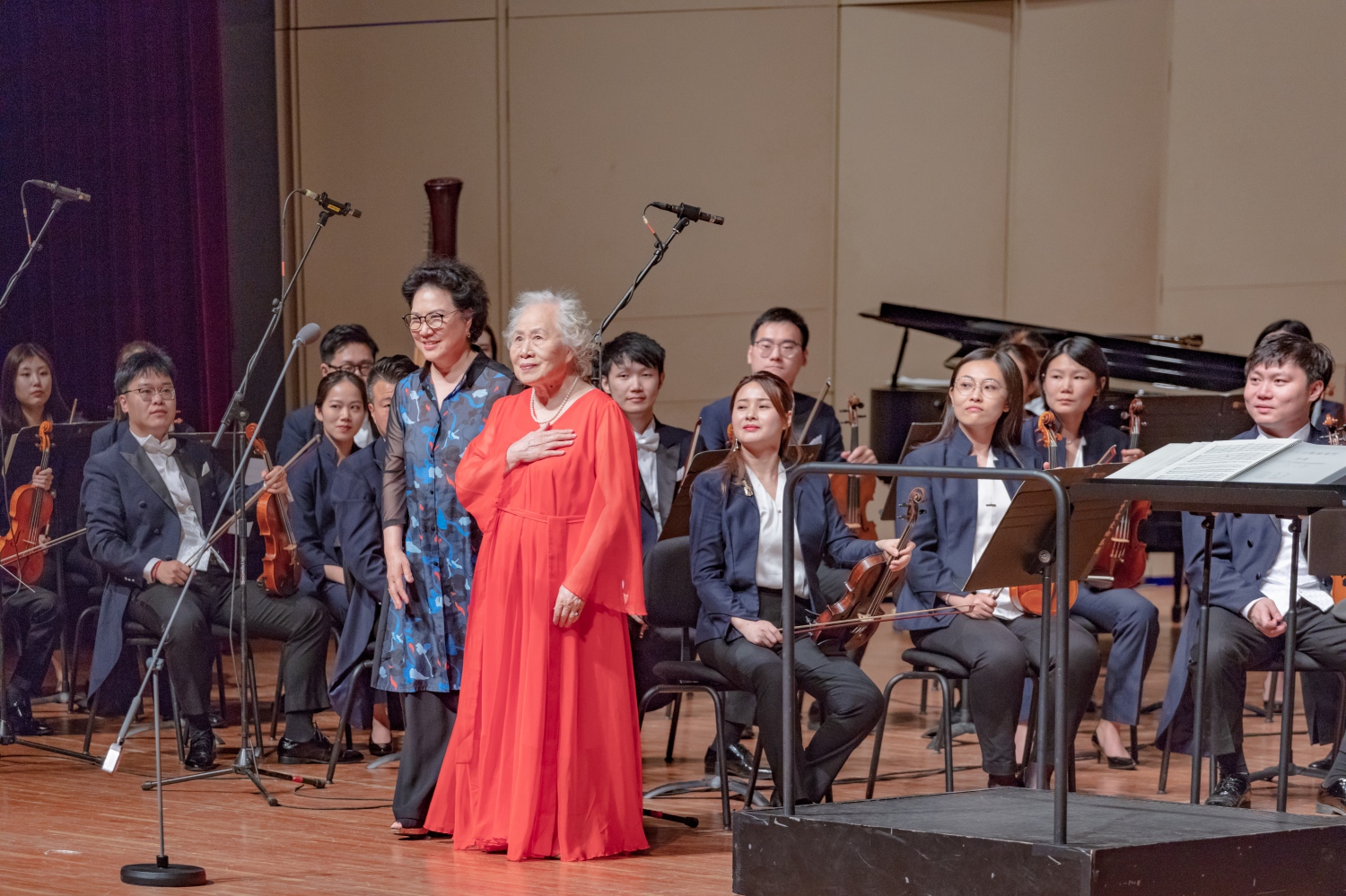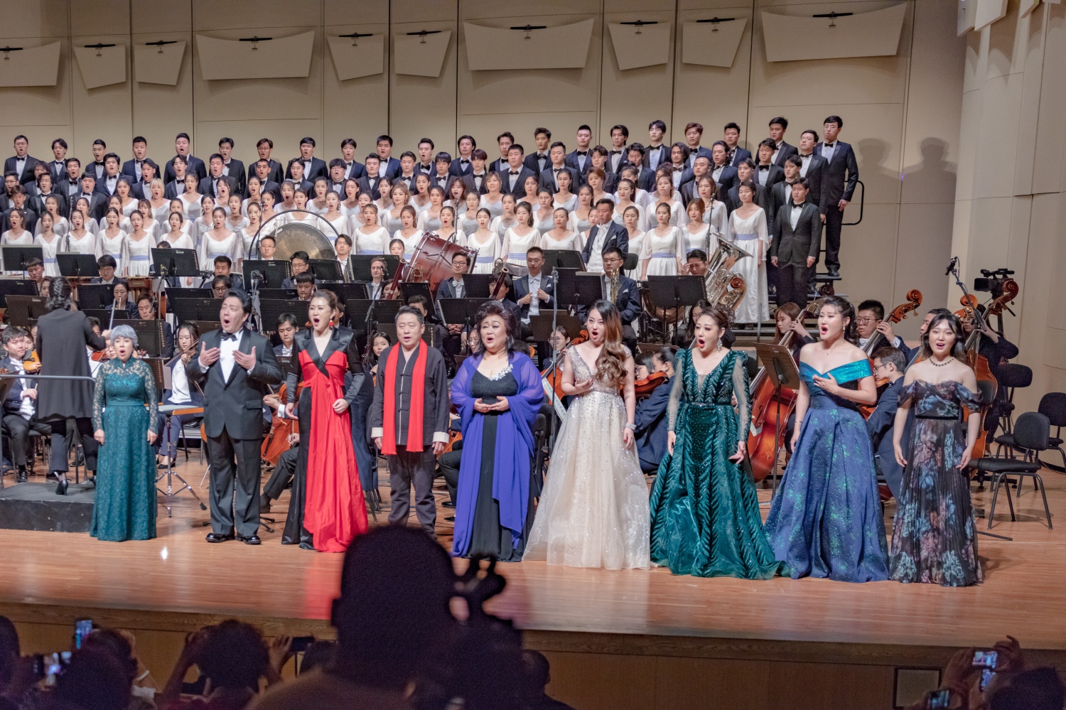 接近尾声的合唱套曲《黄河大合唱》,由100多名声歌系本科学生集体合唱。在声歌系党总支书记陈冰老师的指挥下,他们纯净的音色,有力、激昂,唱出了希望,也饱含了力量,观众席内到处充盈着青春的气息。