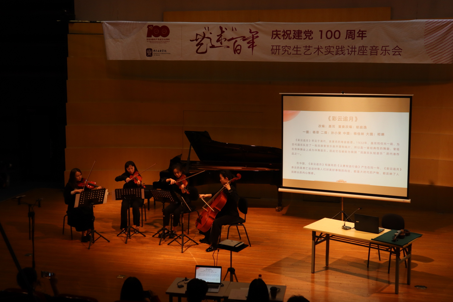 本场音乐会的第四首曲目,是由郁庭逸同学改编的弦乐四重奏《彩云追月》,表演者为杨菲、孙小棠、杨佳林、祁琳。《彩云追月》最早见于清代,系著名的粤音曲谱。1932年,聂耳同任光一起,为百代国乐队定了一批民族管弦乐曲并灌制唱片。它也被称为我国“民族乐队轻音乐”的代表作品之一。《彩云追月》和《义勇军进行曲》创作于同一年,反映了人民群众的内心情感,表达了救亡运动时期人们对美好事物的向往。陈婷老师语重心长地向大家讲述道,聂耳作为一名青年党员积极投身到民族解放革命斗争中,他创作了一系列代表中华民族呼声、充满感召力的、艺术性与思想性完美结合的革命歌曲,为革命音乐开辟出了一条前进的道路。