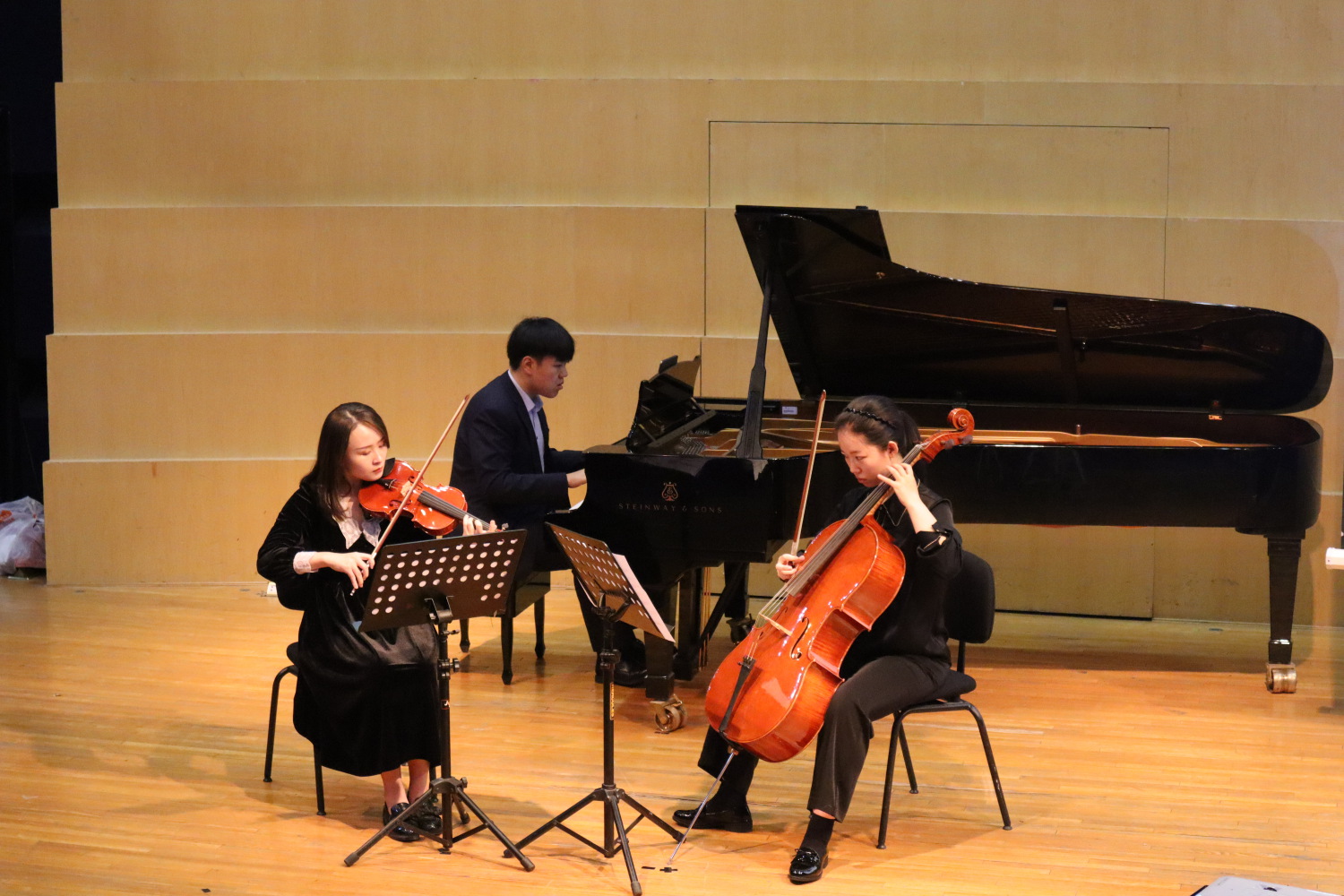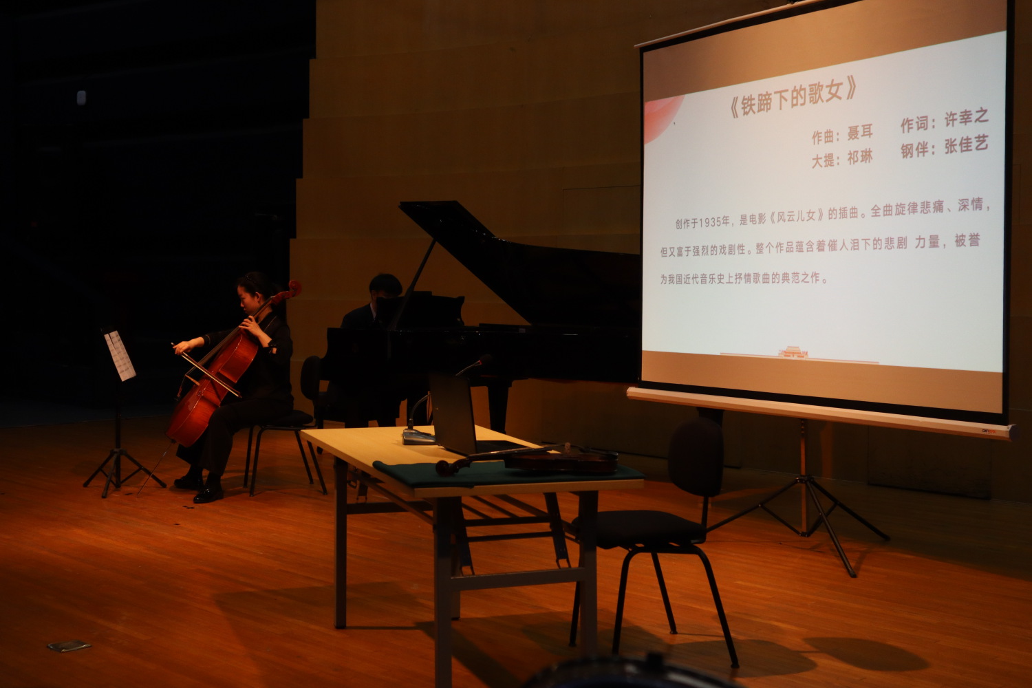音乐会的第二首曲目是大提琴与钢琴二重奏《铁蹄下的歌女》,由郁庭逸改编,大提琴演奏者为祁琳,钢琴演奏者为张佳艺。《铁蹄下的歌女》创作于1935年,是电影《风云儿女》的插曲。全曲旋律悲痛、深情,但又富于强烈的戏剧性。整个作品蕴含着催人泪下的悲剧力量,被誉为我国近代音乐史上抒情歌曲的典范之作。这部作品道出了被旧社会压迫妇女们的心声,即使她们被人们贱视,她们的内心也蕴藏着崇高的爱国热情。这份爱国情感在大提琴的诉说下,表达得更加深沉与坚定,也仿佛更加鲜为外人所知。而当大提琴再现旋律时,音区高出一个八度,音乐获得了更大的张力,歌女的形象更加悲壮慷慨,爱国之情尤为浓烈,有同学评价“仿佛听到了歌女的心声”。