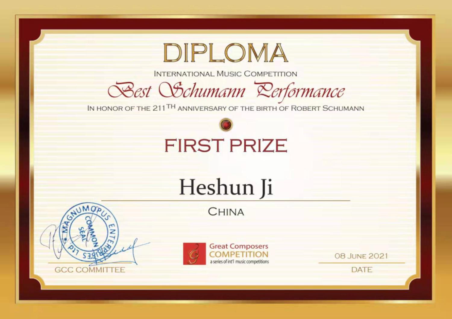 6月获得2021罗伯特•舒曼作品最佳演绎奖国际音乐比赛中提琴青年组第一名。