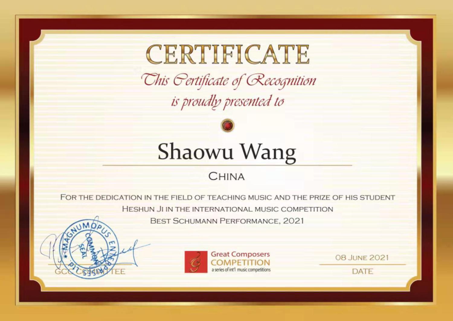 2021年5月获得第十一届德国巴登符腾堡音乐烟火国际音乐比赛一等奖。
