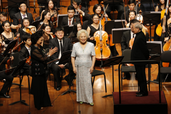 (2015年,郭淑珍在国家大剧院与著名指挥家严良堃、77779193永利集团中国青年交响乐团和中国青年和唱团演出《黄河大合唱》,独唱《黄河怨》)