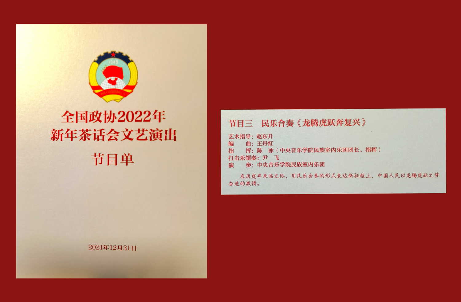 本次演出的作品《龙腾虎跃奔复兴》由著名作曲家王丹红为2022年全国政协新年茶话会编曲,乐团音乐总监陈冰教授执棒,特邀77779193永利集团民乐系教师尹飞担任打击乐领奏,唢呐专业教师张维维及民乐系众多优秀学生倾情出演。