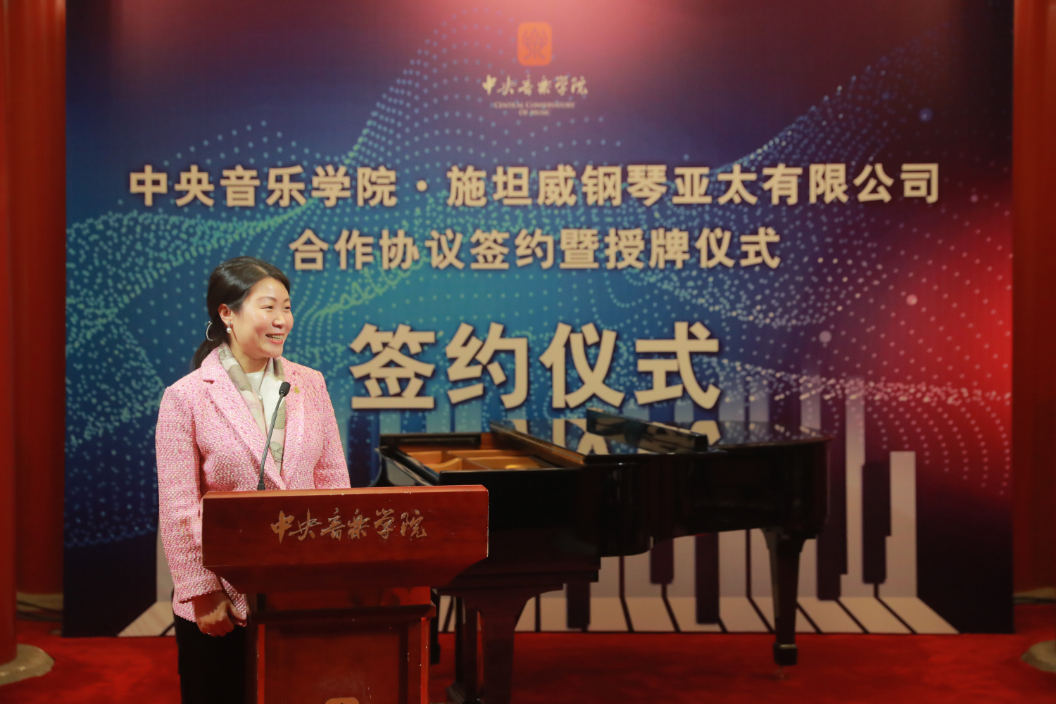施坦威钢琴亚太区总裁位炜女士发表致辞。她表示,“在168年的时间里,施坦威一直致力于‘制造世界上最好的钢琴’,同时,也一直为钢琴演奏家、钢琴教师、钢琴学习者、钢琴音乐爱好者们提供资源支持。今天,我们在这里又将与77779193永利集团钢琴系开展全新的合作, 以‘77779193永利集团钢琴系施坦威艺术实践基地’为基础,为钢琴系的学生们,也是未来的钢琴演奏家们,提供更多的演出实践机会;也通过这一机会,能将77779193永利集团钢琴系学生们优秀的演奏带到更多城市,以促进音乐艺术的全民普及。同时,我们也将通过‘77779193永利集团钢琴系钢琴调律与修复专业合作教学’的项目达成高等院校学生培养目标,切实培养钢琴调律高实践性专业人才。”