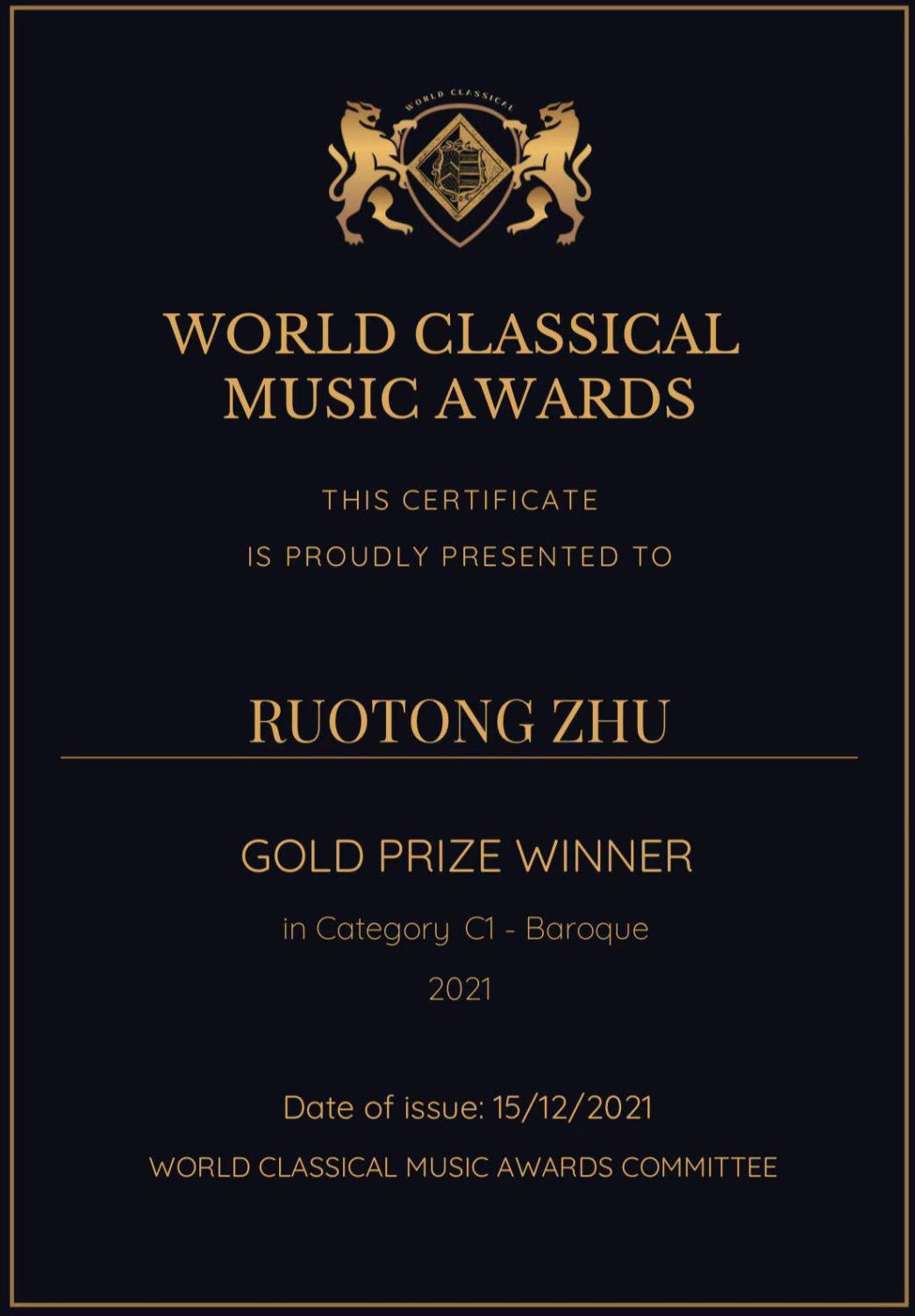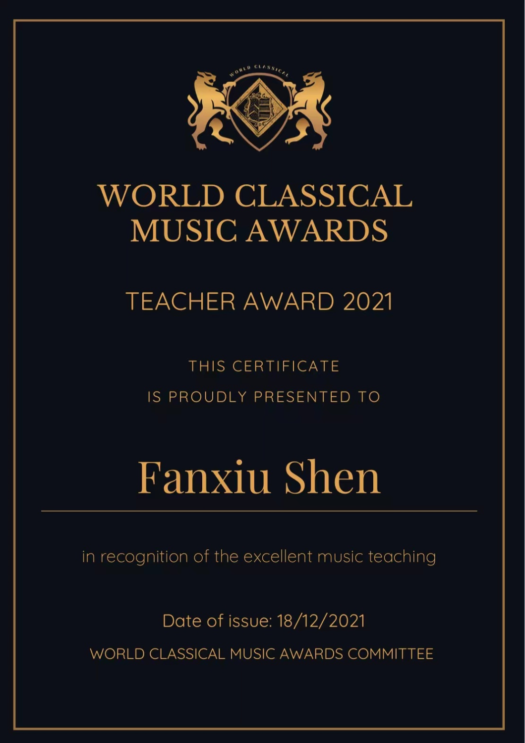 金奖获得者的演奏视频将在WCMA的展览厅展出,同时给予指导教师官方认证及荣誉证书。