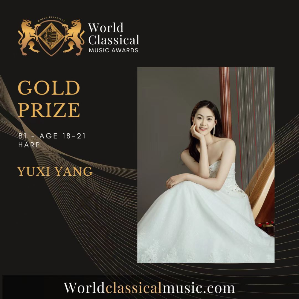 管弦系本科一年级竖琴专业学生杨雨茜荣获英国世界古典音乐大奖World Classical Music Awards (WCMA)独奏组金奖与现代主义风格演奏组金奖