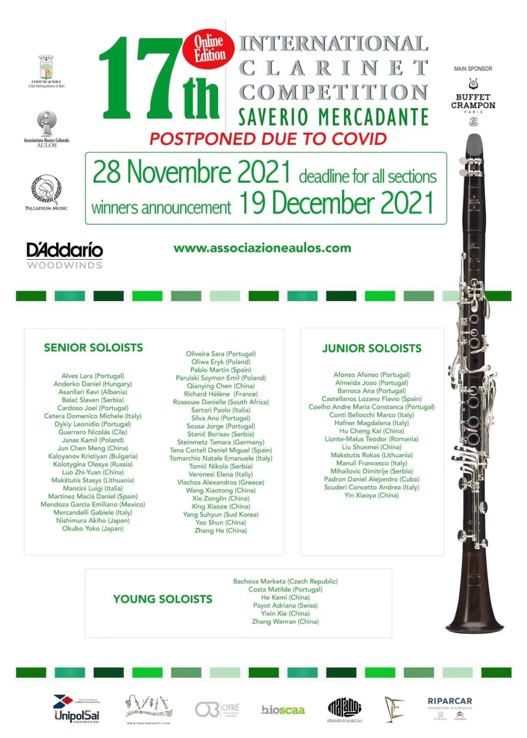 “Saverio Mercadante”国际单簧管比赛是意大利最负盛名、专业度最高、最大影响力的单簧管国际比赛。比赛以意大利著名作曲家Saverio Mercadante(1795-1870)命名,他出生于普利亚大区BARI省的Altamura市,主要创作题材为歌剧,虽然在世界范围内的名气不及同时代的多尼采蒂和罗西尼,但他的歌剧作品,对歌剧结构的发展研究、旋律的风格和配器对后期的威尔第其卓越的创作技巧起到了伟大的铺垫作用。本届比赛评委包括波兰国家交响乐团首席、华沙肖邦艺术大学单簧管教授Arek Adamski先生,德国弗莱堡音乐学院教授Kilian Herold先生,荷兰鹿特丹爱乐乐团单簧管首席Julien Hervé先生,意大利米兰音乐学院教授Laura Magistrelli女士,葡萄牙里斯本音乐学院教授Rui Martins先生等众多世界级演奏家、教育家。本次参赛选手分别来自中国、意大利、法国、德国、波兰、葡萄牙、韩国、日本、墨西哥、匈牙利、俄罗斯等16个国家共计43名职业选手。