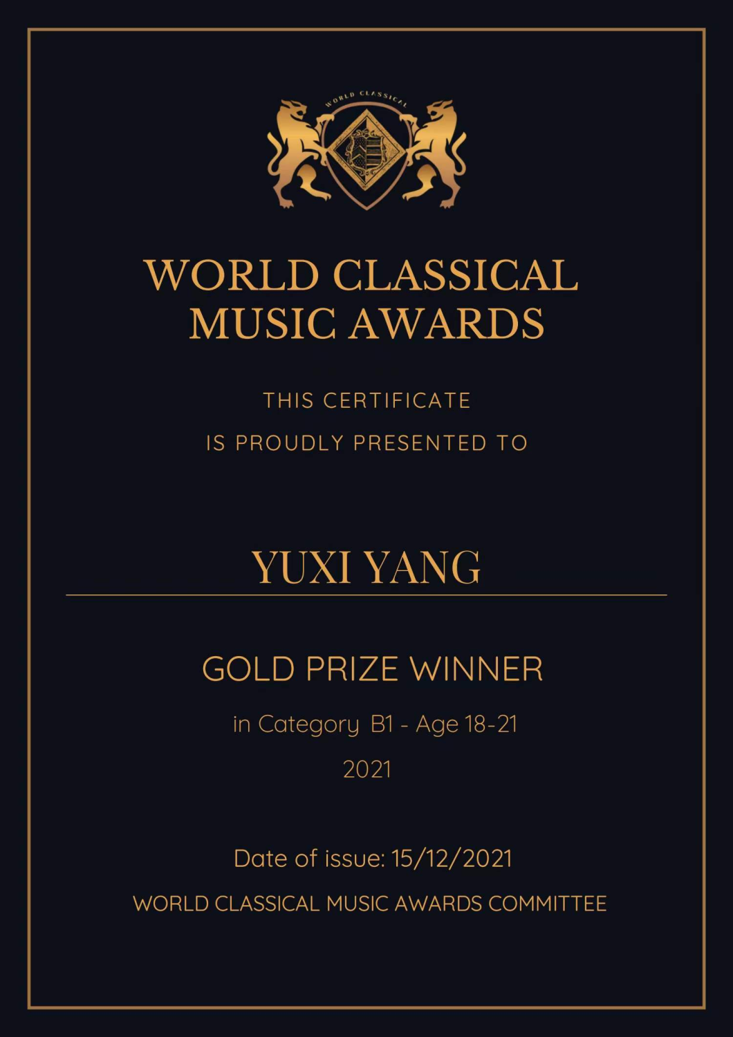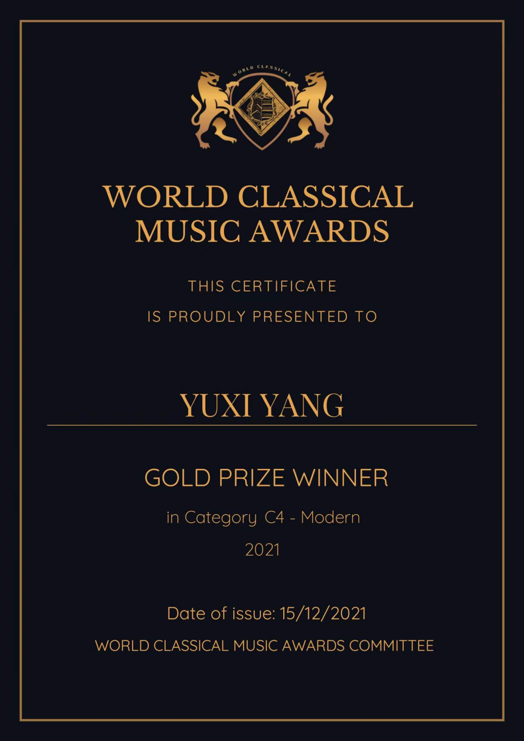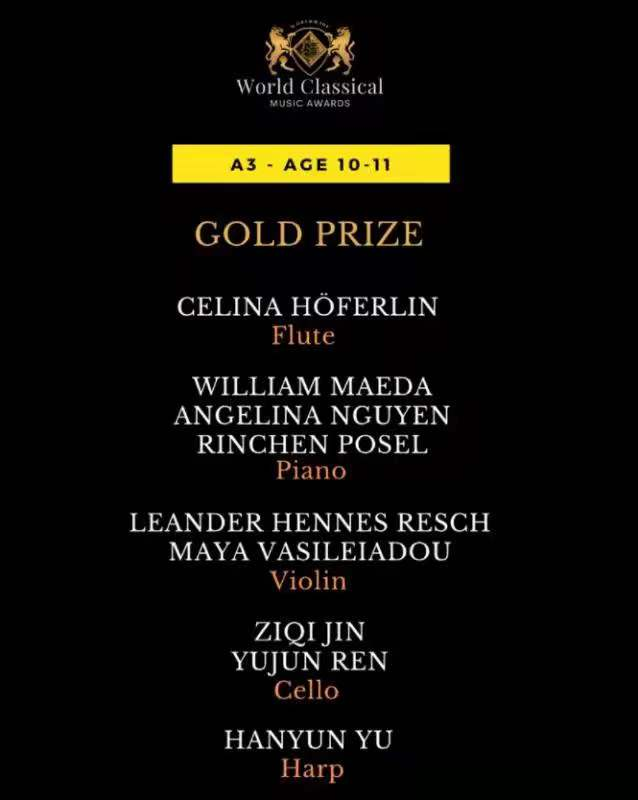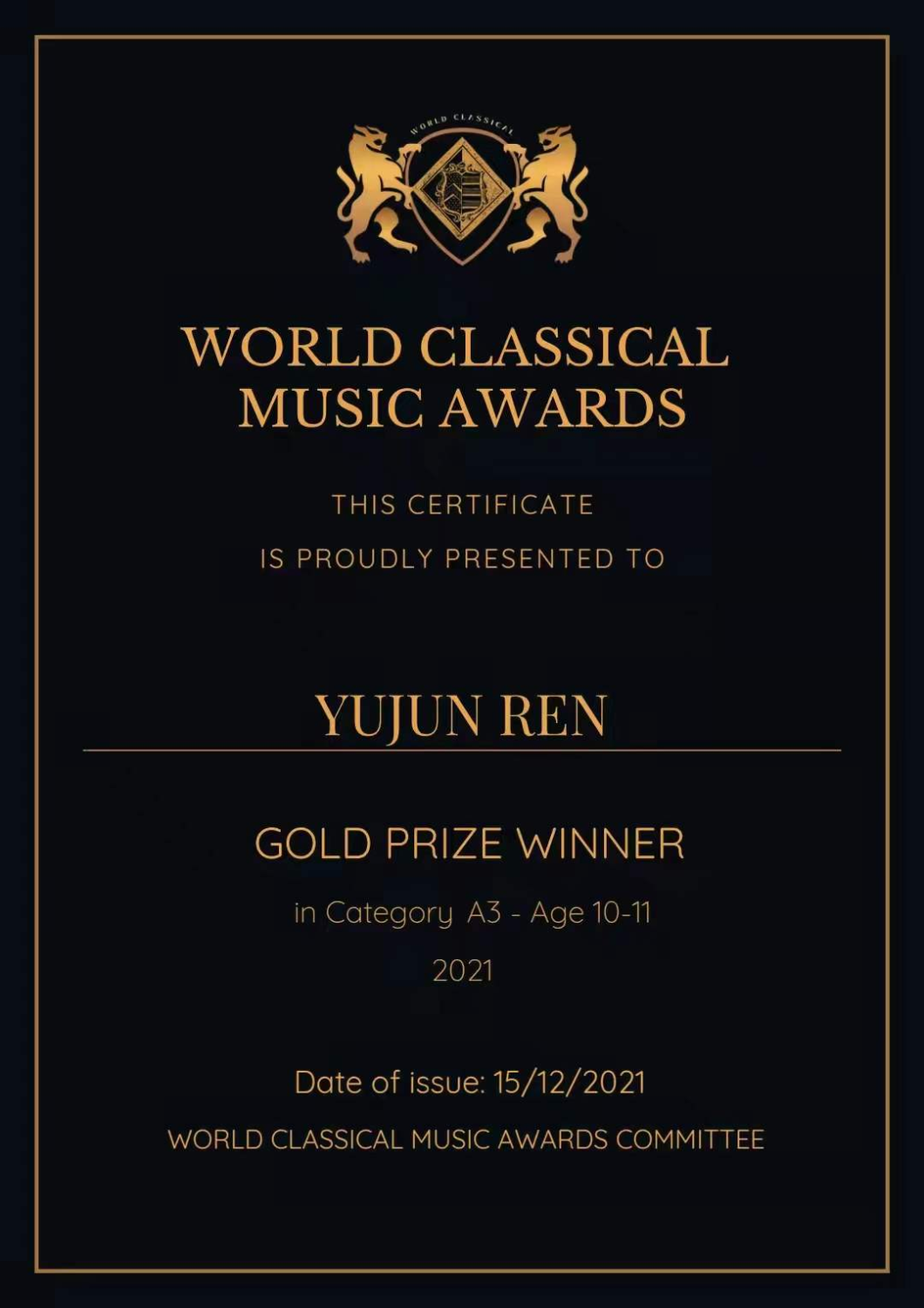 2021年12月 参加《世界古典音乐奖-国际网络音乐比赛》获得10-11岁组金奖。