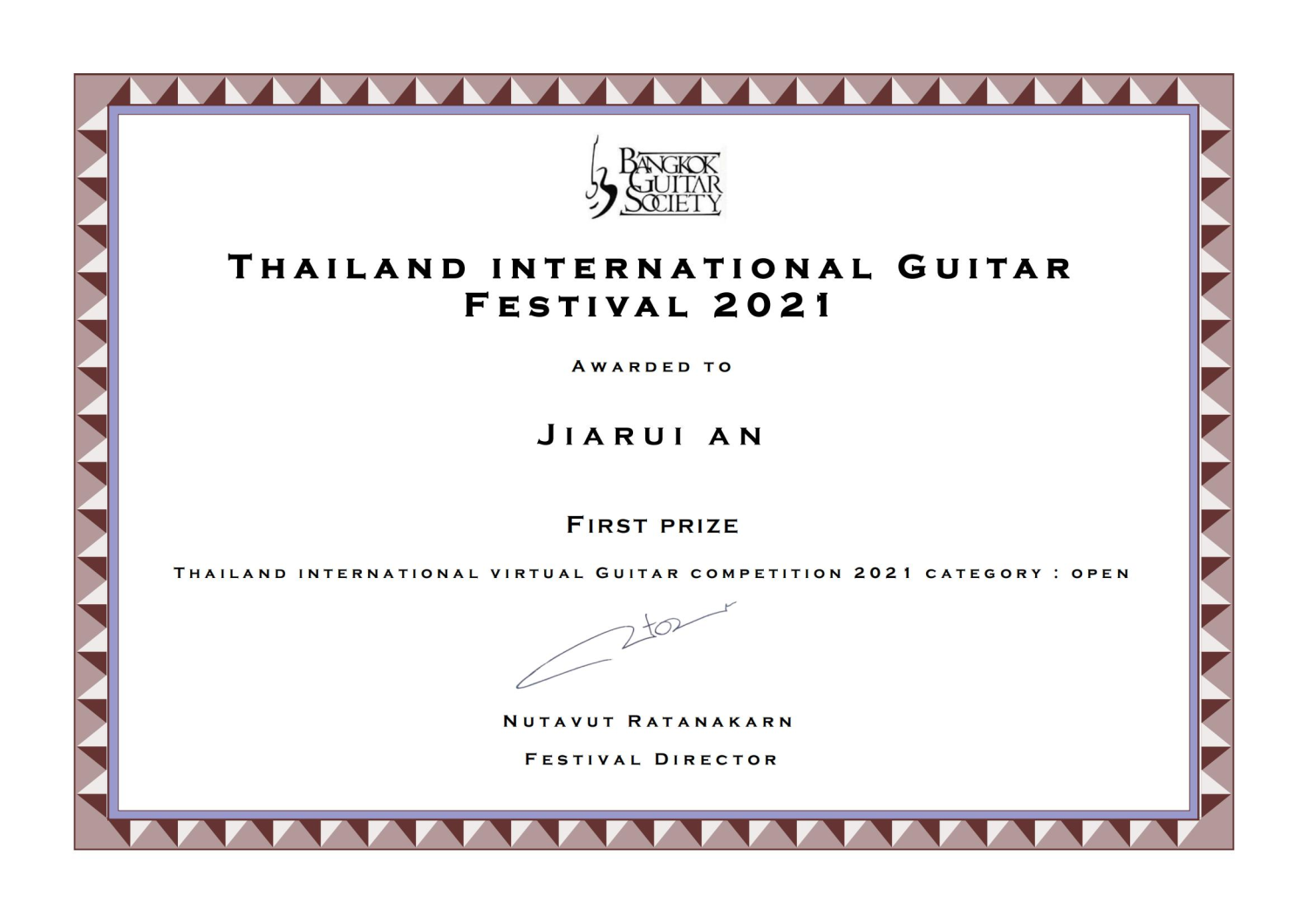 管弦系本科三年级古典吉他专业学生安佳瑞荣获2021泰国国际吉他比赛(Thailand International Guitar Competition 2021 )第一名