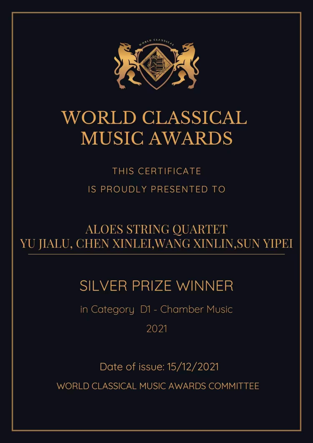 2021年12月,荣获世界古典音乐大奖赛World Classical Music Awards (WCMA)独奏组金奖、现代主义风格演奏组金奖。