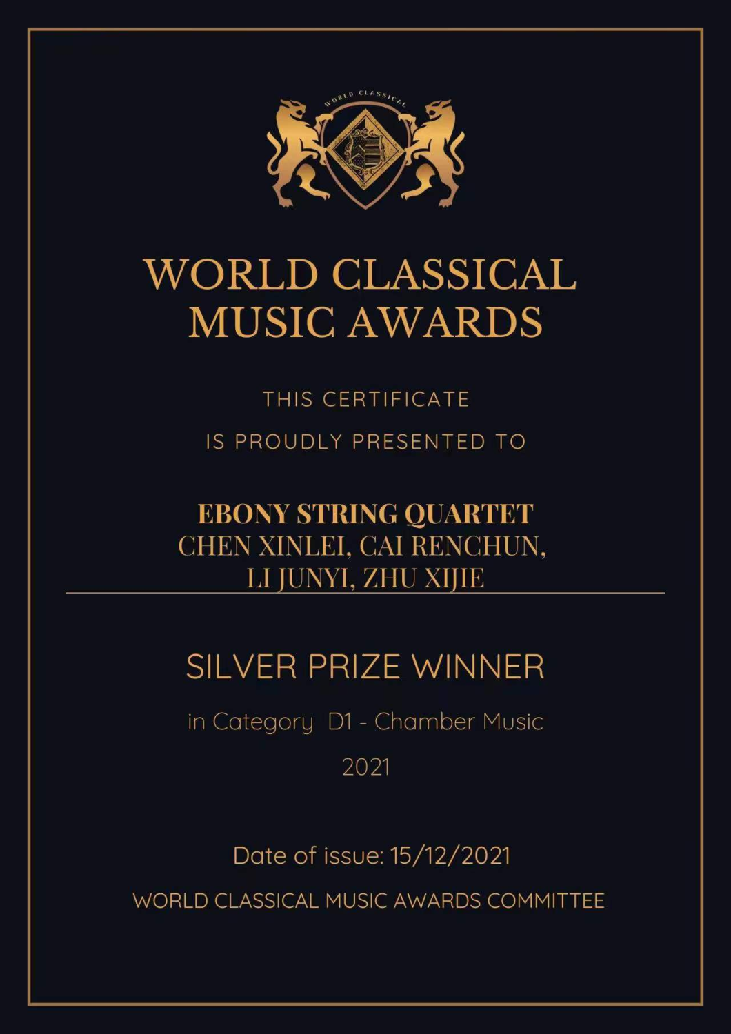 “Aloes弦乐四重奏”、“Ebony弦乐四重奏”荣获英国世界古典音乐大奖World Classical Music Awards (WCMA)室内乐组银奖