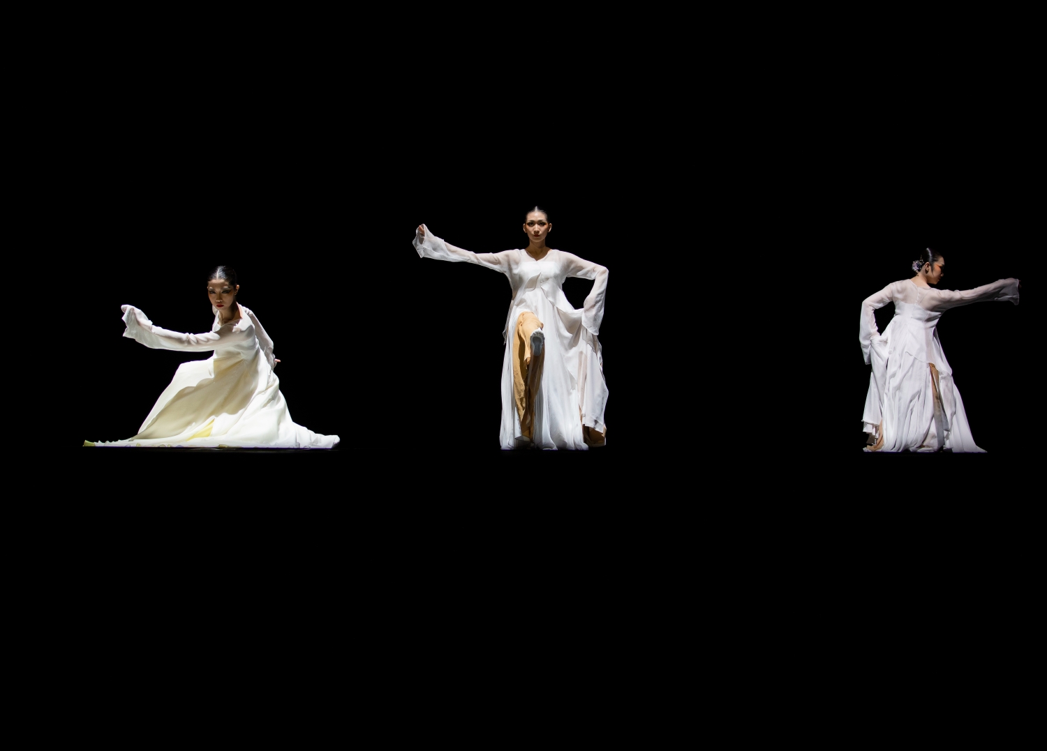 第四首作品现代双人袖舞《生轮》,李姿敏编舞,李玥锦作曲。“生死如旋火,轮回似麻稻。不解早觉悟,为人枉虚老”。在音乐设计中作曲者用古琴做慢板部分的主奏乐器,以表现出袖舞由内而外延伸出的张力;快板部分则使用锣鼓表现中国传统文化的精气神;整个作品用弦乐群渲染出作品混沌与厚重的基调,加之青衣、老生唱腔的点缀,使得一部现代舞蹈作品融入了更多传统文化底蕴。