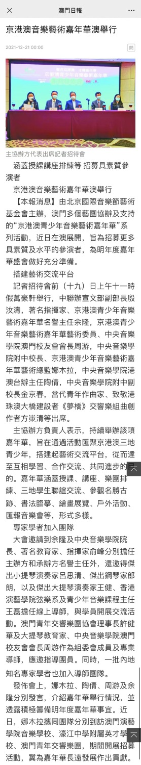 2021年12月17日,为积极筹备2022年京港澳青少年音乐艺术嘉年华,此次娜木拉校长携专家团队专程赴澳门演艺学院音乐学校、澳门濠江中学英才学校、澳门青年交响乐团进行招募活动。