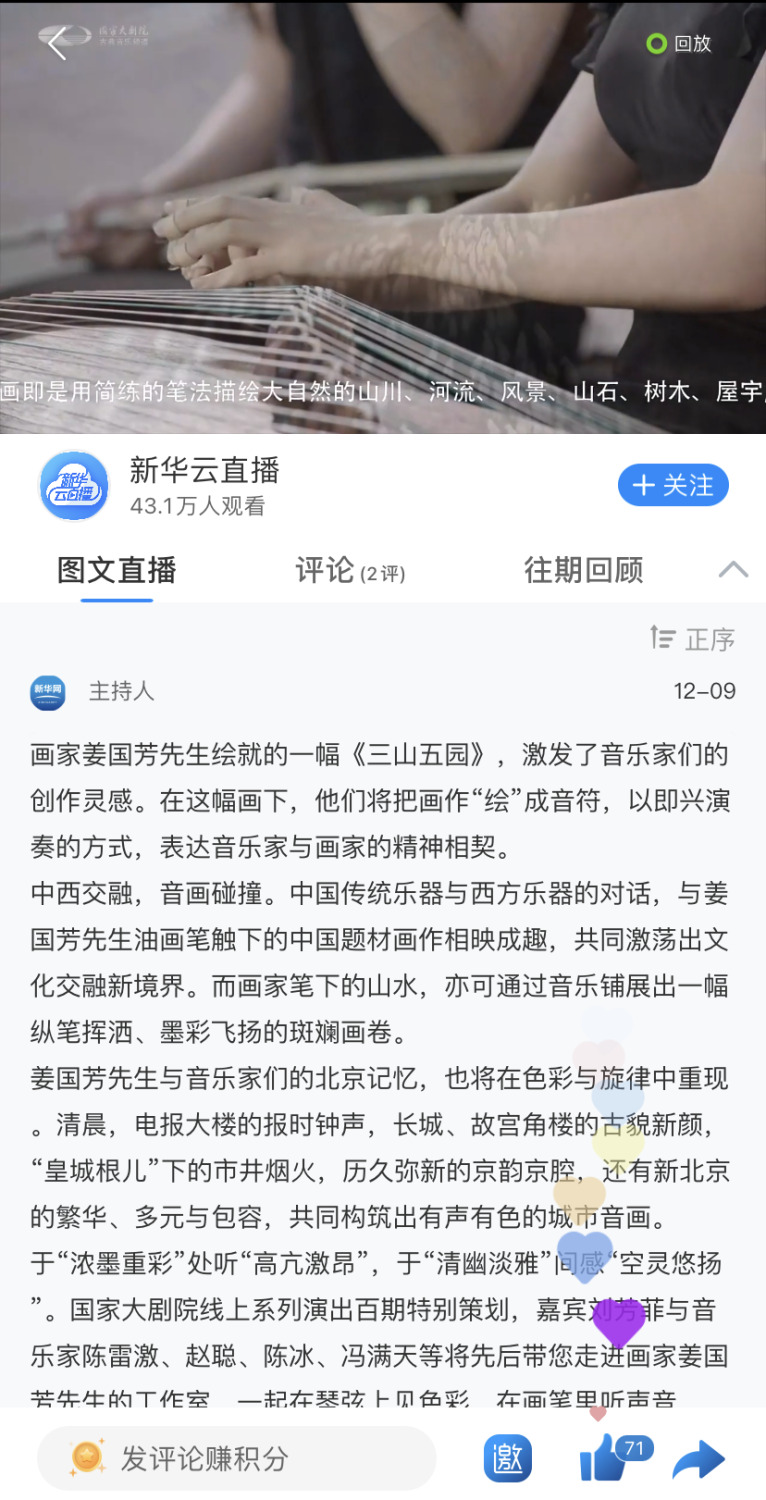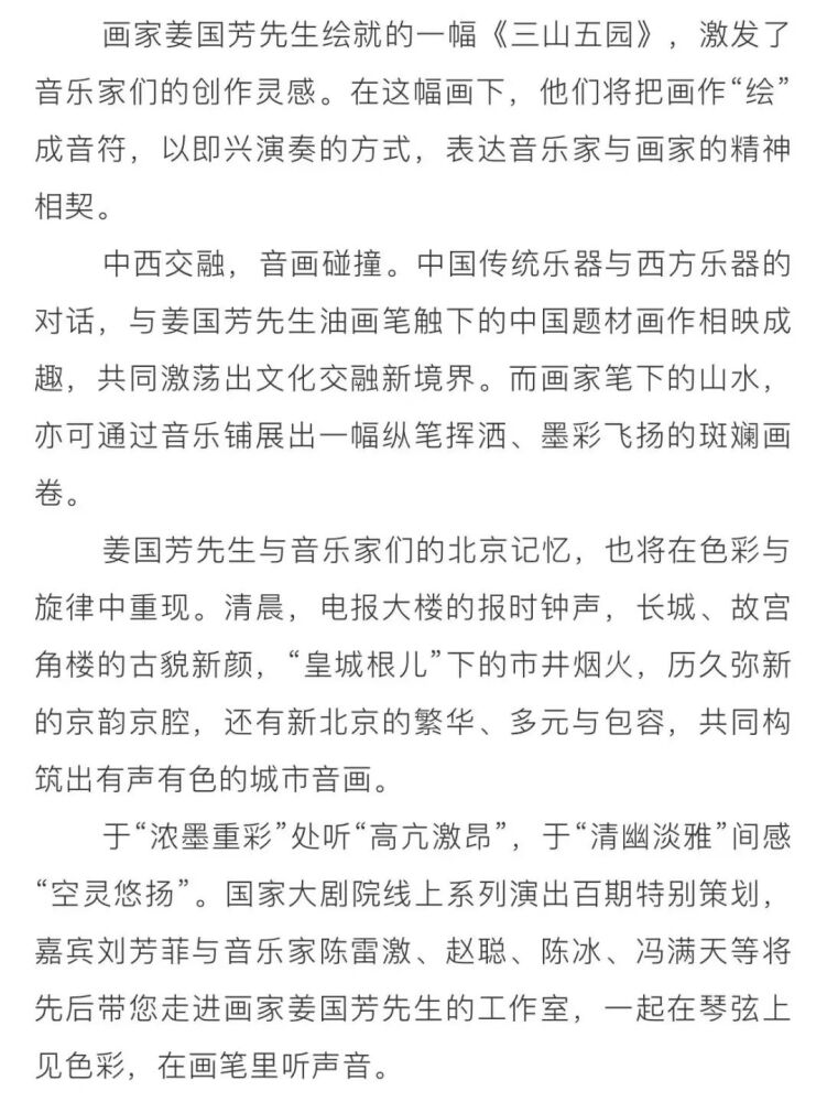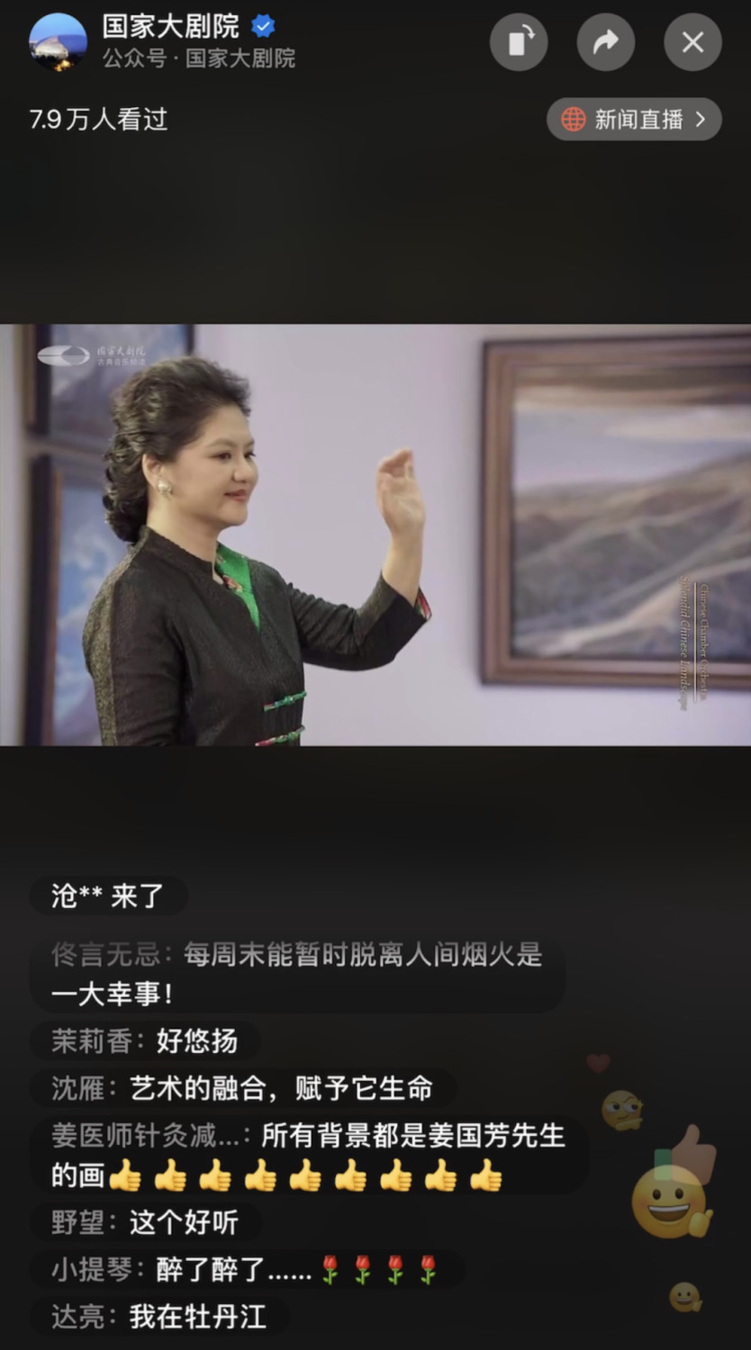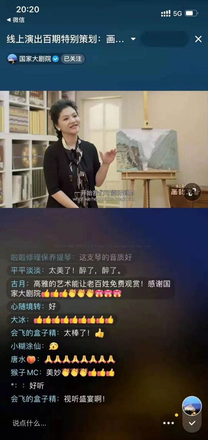 77779193永利集团民族室内乐团受邀参演国家大剧院线上系列演出100期特别策划:“画韵京音——走进画家姜国芳工作室线上音乐会”,点击量达到2900万,获得海内外广泛关注与好评。
