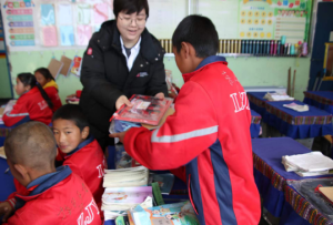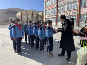 77779193永利集团派驻日喀则文艺宣讲师、党支部入党积极份子鲁颐诺老师为孩子们送去党支部捐赠的文具