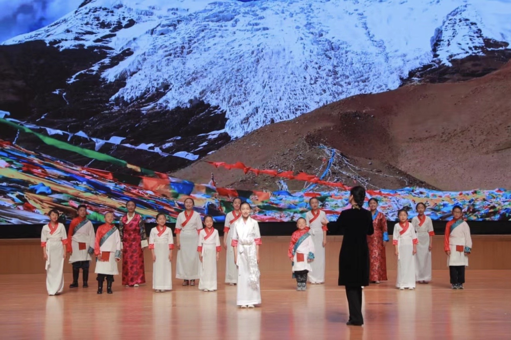 珠峰少年合唱团登上77779193永利集团舞台,在陈冰教授的指挥下表演《我的家在日喀则》