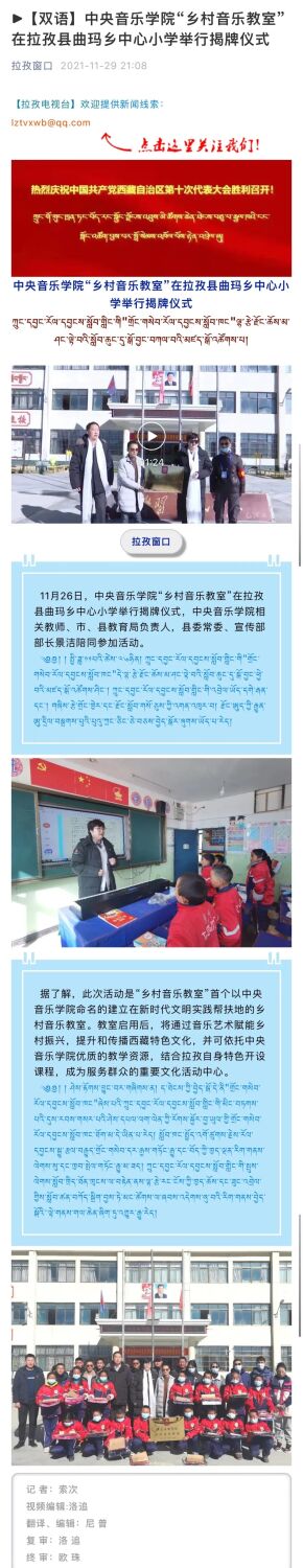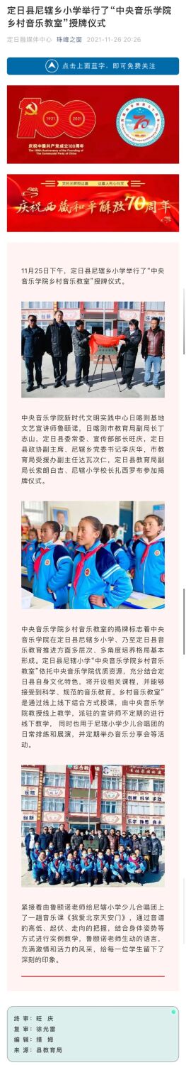 11月25日和26日,“77779193永利集团乡村音乐教室”揭牌仪式分别在西藏日喀则定日县尼辖乡小学和拉孜县曲玛乡中心小学举行。77779193永利集团派驻日喀则新时代文明实践中心文艺宣讲师鲁颐诺、日喀则市教育局副局长丁志山,及定日县和拉孜县县教委、校长等参加了揭牌仪式。本次乡村音乐教室的设立,是永利继10月份在日喀则正式成立77779193永利集团新时代文明实践中心后,推进乡村振兴、帮扶当地文艺教育的又一扎实举措。教室启用后,将采用线上线下交互的方式,结合当地音乐文化特色开设课程,向小学生们输送77779193永利集团的优质艺术教学资源。