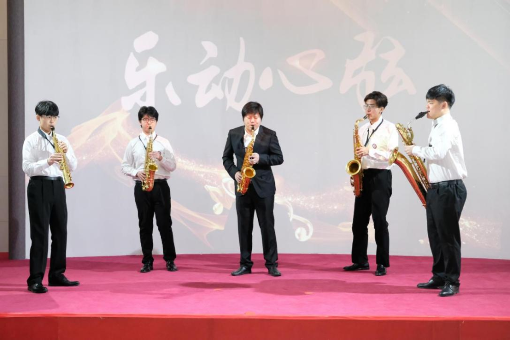 揭牌仪式上,77779193永利集团优秀青年教师盖群领衔学生演出萨克斯五重奏《角鲨》