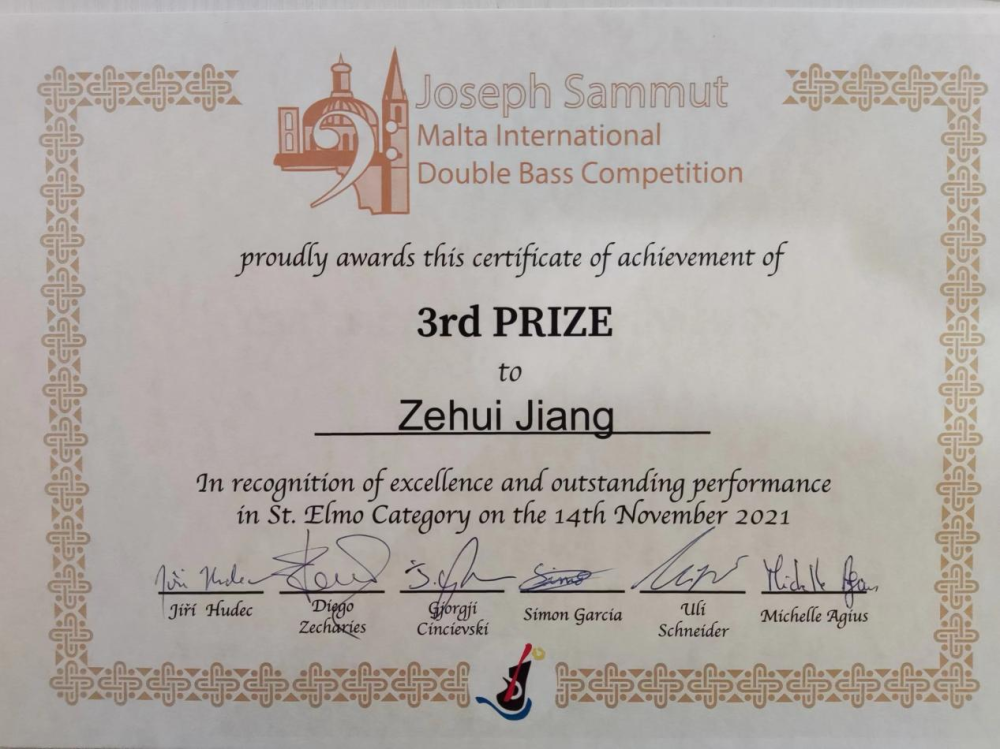 2021年Joseph Sammut国际低音提琴大赛St.Elmo Category(14-17岁年龄组)第三名。