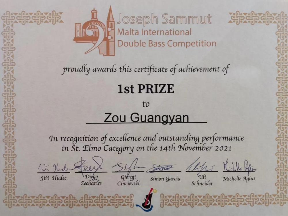 2021年荣获第四届新加坡SGP国际音乐节西洋乐大赛低音提琴专业少年组一等奖。
