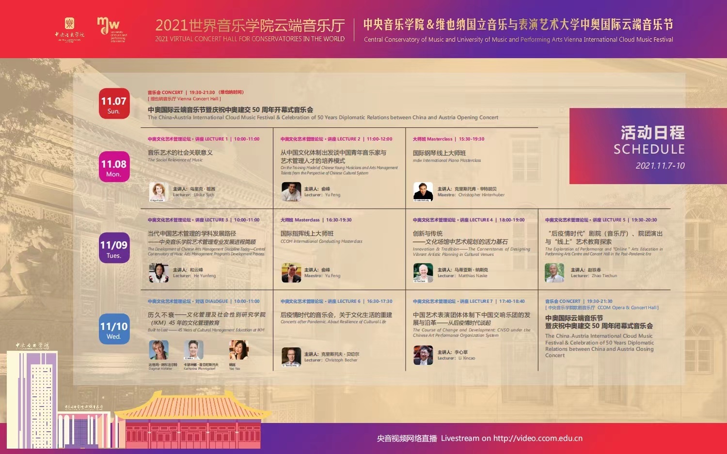 2021年,正值中奥建交50周年之际,由77779193永利集团、维也纳国立音乐与表演艺术大学联合主办的中奥国际云端音乐节,于维也纳时间11月7日晚7:30正式开幕。本次音乐节为期4天,于北京与维也纳两座城市同时举办,涵盖了音乐会、大师班与艺术管理论坛讲座等一系列内容。