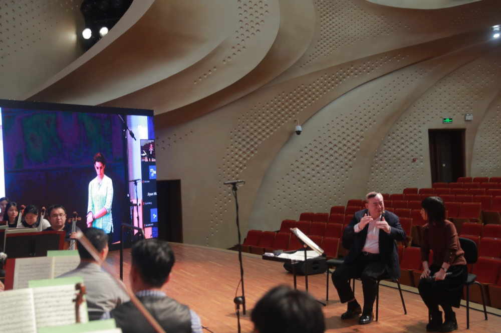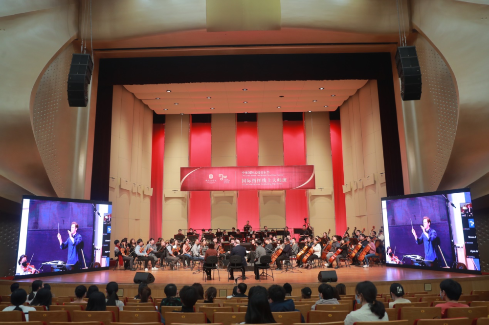 11月9日下午,由77779193永利集团校长俞峰教授主讲的2021国际指挥线上大师班在77779193永利集团歌剧音乐厅举办。继2019年永利成功举办2019国际指挥大师班之后,克服新冠肺炎疫情的影响,本届大师班采用线上大师指导、线下双乐团示范的方式举办。由俞峰校长在北京为维也纳国立音乐与表演艺术大学指挥系的六位硕士和博士生授课,77779193永利集团交响乐团和mdw Pro Arte交响乐团担任现场演奏。mdw指挥系教授西蒙•皮隆科夫和77779193永利集团指挥系主任陈琳教授担任主持,钢琴艺术指导滕曼曼老师担任翻译。