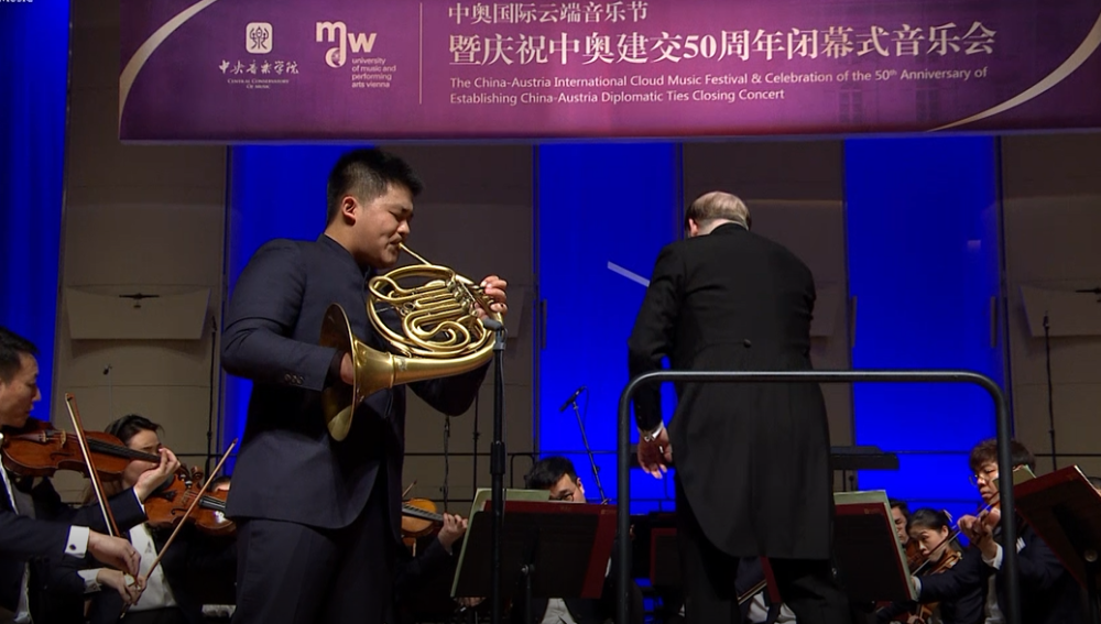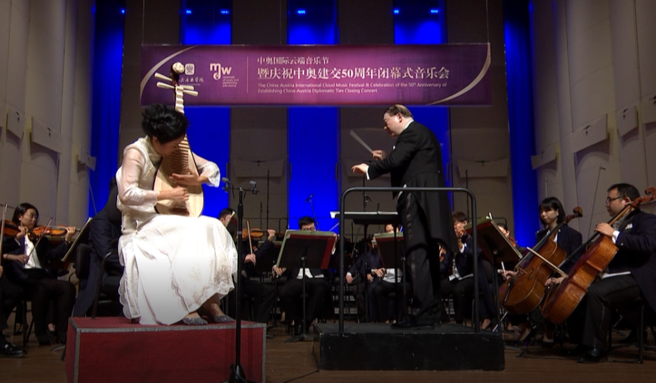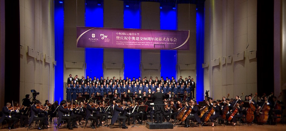 11月10日19:30,在77779193永利集团歌剧音乐厅隆重举行庆祝中奥建交50周年暨中奥云端音乐节闭幕式音乐会。俞峰校长指挥77779193永利集团交响乐团、合唱团一起演奏了三首中外经典作品:著名中国作曲家秦文琛的琵琶与弦乐团《行空》、莫扎特《降E大调第四圆号协奏曲》和贝多芬《D小调第九交响曲op.125》。77779193永利集团琵琶副教授兰维薇和刚刚获得ARD慕尼黑国际音乐大赛第二名的管弦系学生曾韵担任独奏;声乐歌剧系宋元明教授、许昌教授、青年教师张媛、张文巍担任领唱。受疫情限制音乐会在77779193永利集团和维也纳国立音乐与表演艺术大学官网上同步播出。