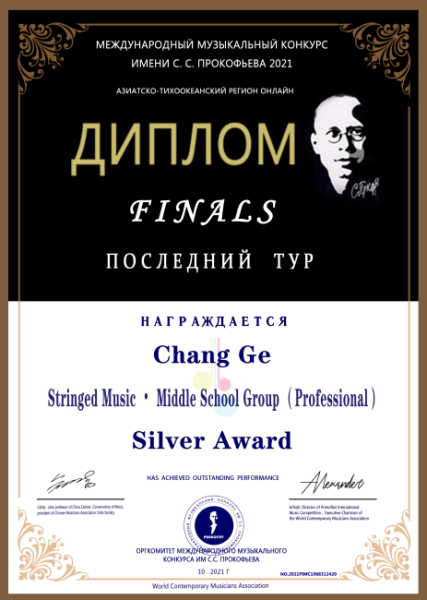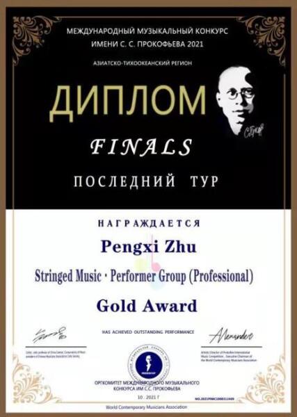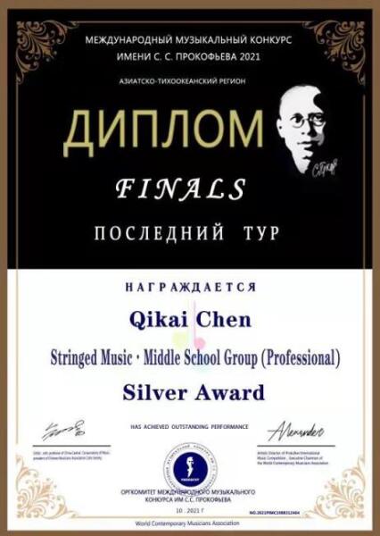 2021年10月荣获普罗科菲耶夫国际音乐大赛亚太区弦乐中学专业组银奖;