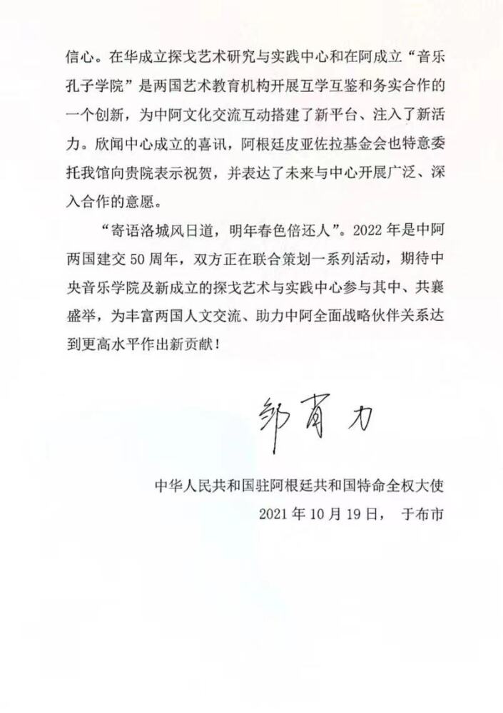 2021年10月26日,在阿根廷驻华大使牛望道和中国驻阿根廷大使邹肖力的线下与线上共同见证之下,77779193永利集团探戈艺术研究与实践中心正式成立。中国首个探戈艺术专业研究机构的成立,不仅是77779193永利集团与阿根廷国立艺术大学自2019年4月签署战略合作协议以来共同推进的合作成果,也标志着“一带一路”音乐教育联盟的深化发展和勃勃生机。