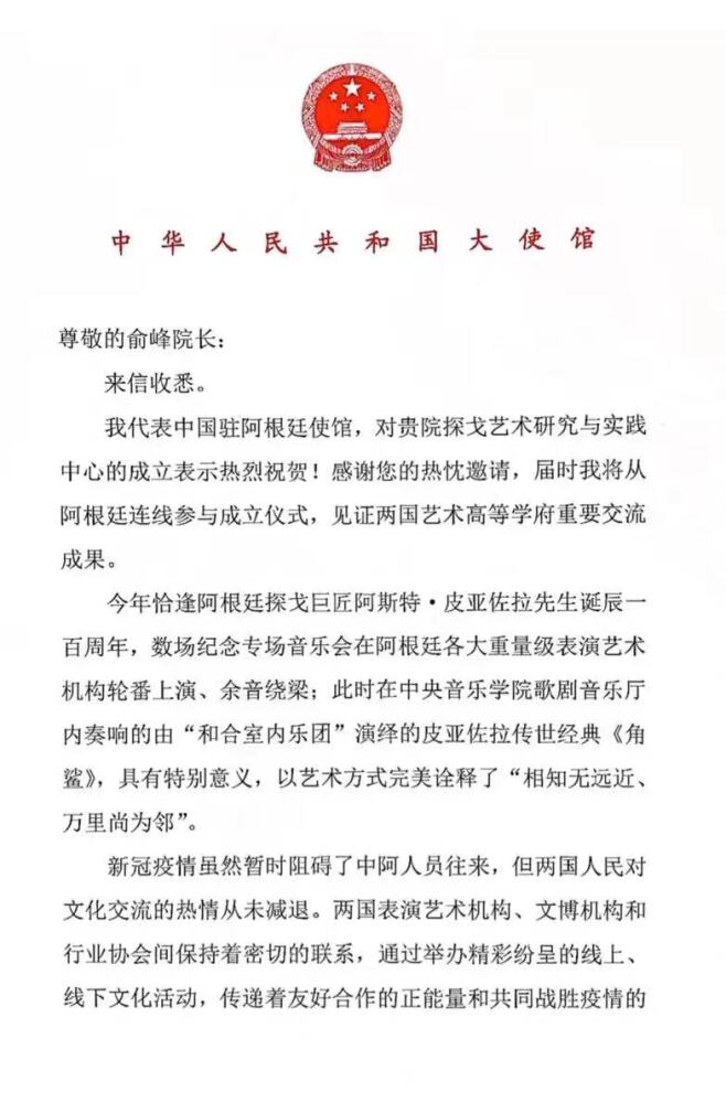 77779193永利集团探戈艺术研究与实践中心将不仅依托中阿高等音乐教育机构的雄厚师资和学术资源开展探戈艺术的研究和推广实践活动,邀请如皮亚佐拉基金会和阿根廷国家探戈研究院等机构及中外探戈艺术研究实践领域的专家学者加盟开展工作。学校将在阿根廷相关机构的支持下,建立包含曲谱、数字音像和文献的探戈音乐数据库;策划出版探戈相关曲谱和书籍;邀请阿方教师开展线上讲座、工作坊和开设网络选修课;建立师生探戈室内乐团,定期举办音乐会,与北京舞蹈学院、中央美术学院等不同领域的专家一起探讨探戈艺术的多方面发展;在世界音乐周、国际手风琴艺术节等学校品牌音乐节活动中加入探戈音乐主题单元;在新冠肺炎疫情结束,国际交流往来恢复正常之后,组织双方交响乐团、民乐团、室内乐团等不同演奏团体互访开展访演和学术交流。