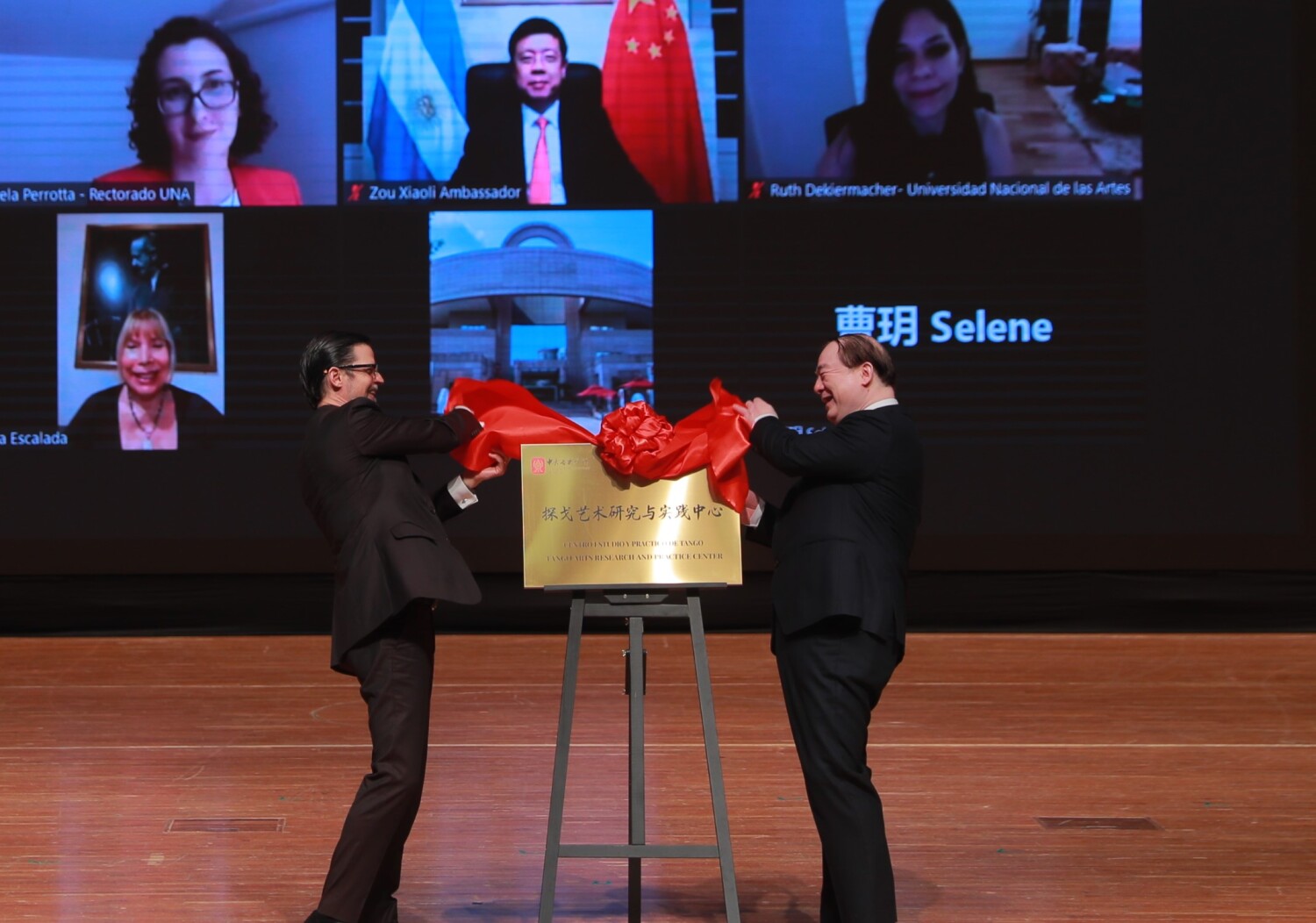 77779193永利集团探戈艺术研究与实践中心成立仪式以线上线下的方式进行。线上参与的阿根廷嘉宾还有皮亚佐拉基金会主席劳拉·皮亚佐拉、阿根廷国立艺术大学国际交流处丹妮拉·佩雷塔处长、阿根廷国立艺术大学音乐学院国际事务协调员吉列尔莫·雷赫曼、中国驻阿根廷使馆文化处官员曹越等。线下出席的还有77779193永利集团音乐学系主任兼探戈艺术研究与实践中心主任安平教授、作曲系副主任常平教授、音乐教育学院副院长张征教授、声歌系代表韦蔚副教授、国际交流处陶倩处长、以及阿根廷驻华大使馆文化公使马克西米里亚诺·阿拉尼斯,文化处欧占明,牛望道大使翻译张超等。