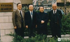 1990年,赵沨与原77779193永利集团党委书记、副院长吕骥(其前任)和原院长吴祖强(其后任)、于润洋合影(从右至左)。