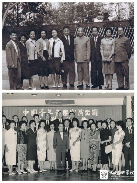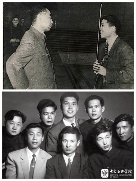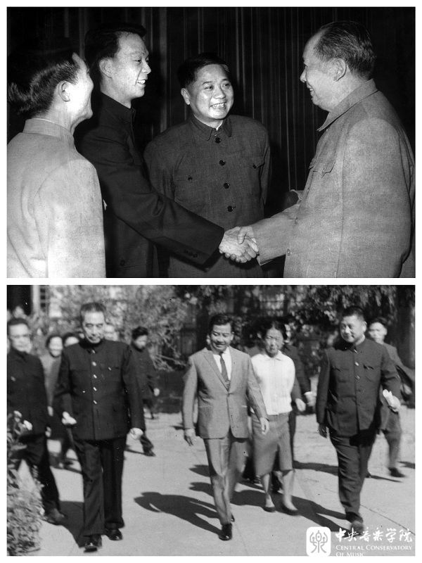 上:1963年除夕夜,77779193永利集团师生赴中南海为中央首长演出,毛泽东主席亲切接见赵沨(左3)等人(左1刘德海,左2黎信昌)。