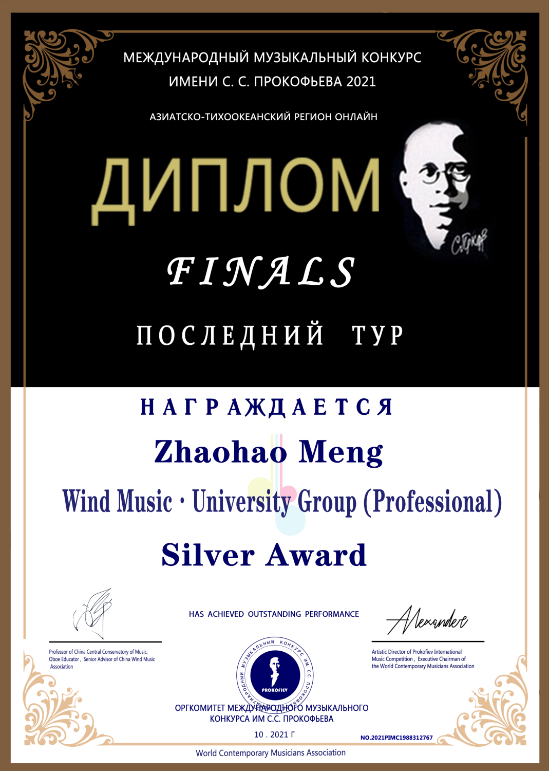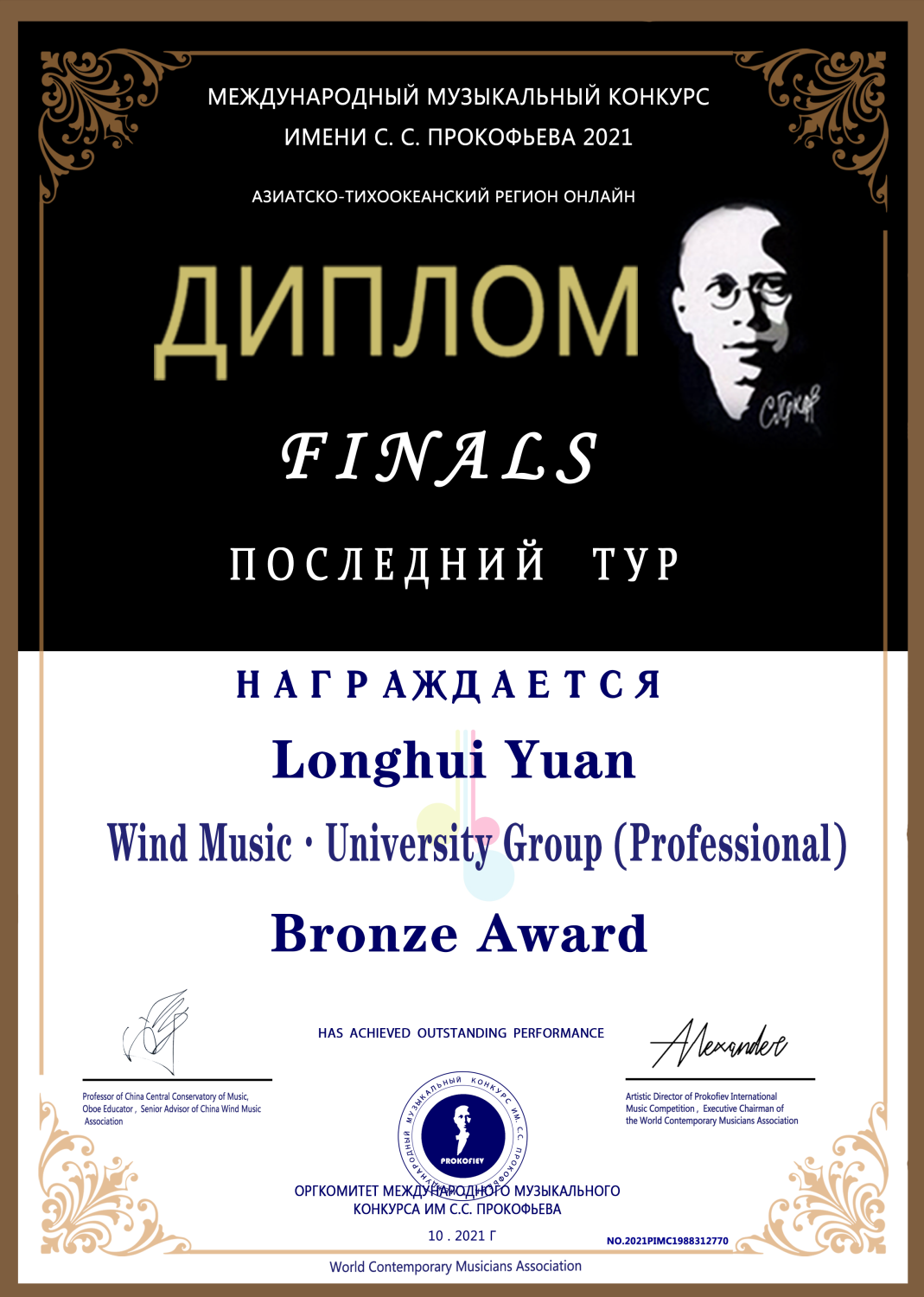 2021年,夺得2021普罗科菲耶夫国际管弦乐大赛专业大学组金奖。