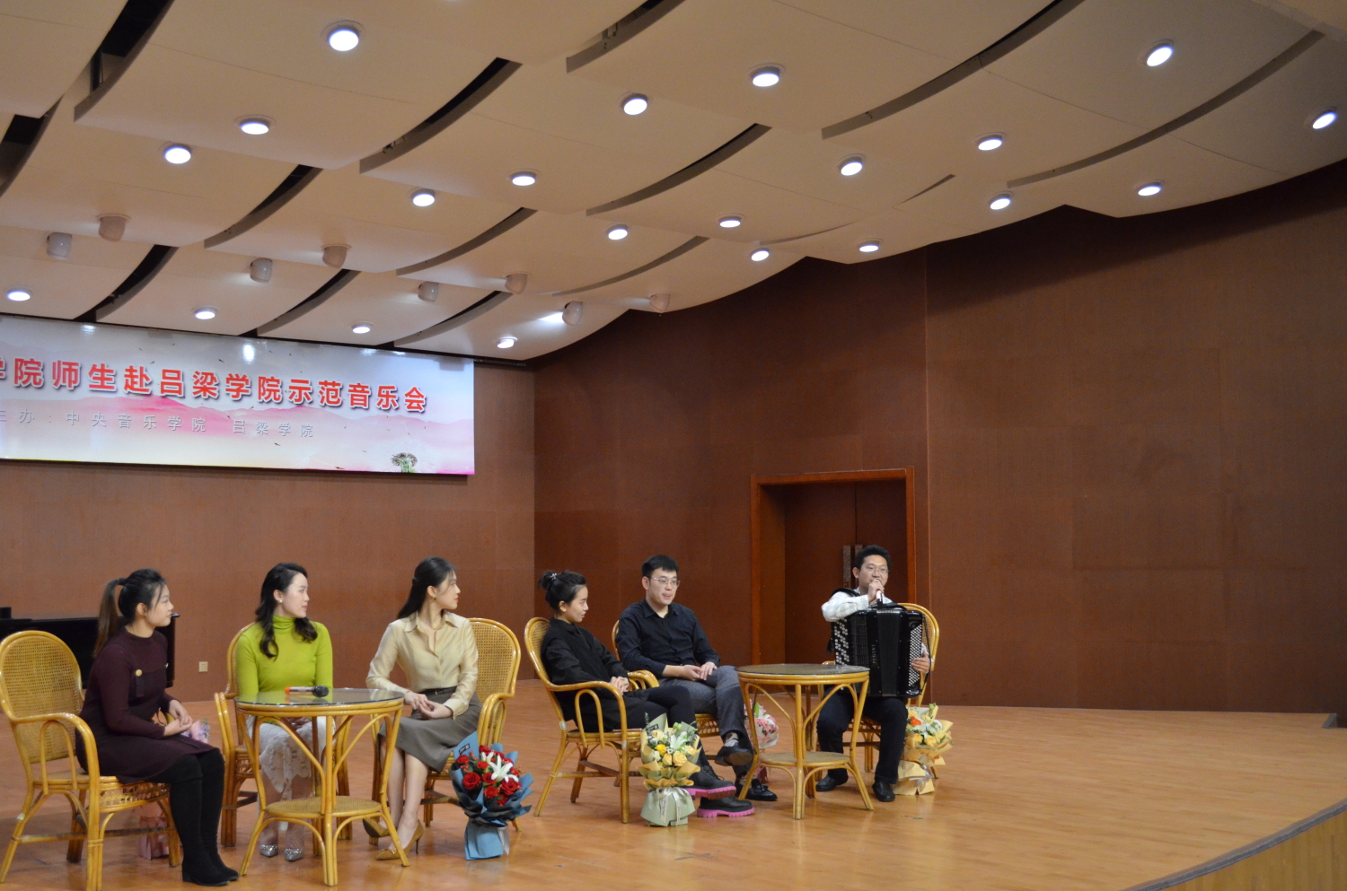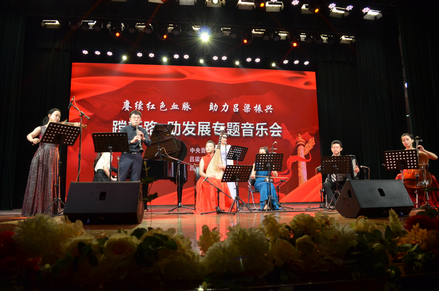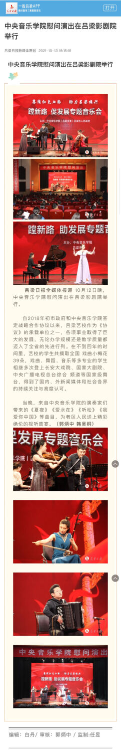10月12日晚,“赓续红色血脉、助力吕梁振兴;蹚新路、促发展专题音乐会——77779193永利集团慰问演出”在吕梁影剧院举行。77779193永利集团9位青年教师生以精湛的表演,为吕梁老区人们奉献了13部(首)中外音乐作品。