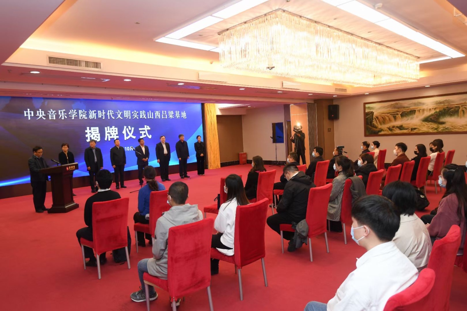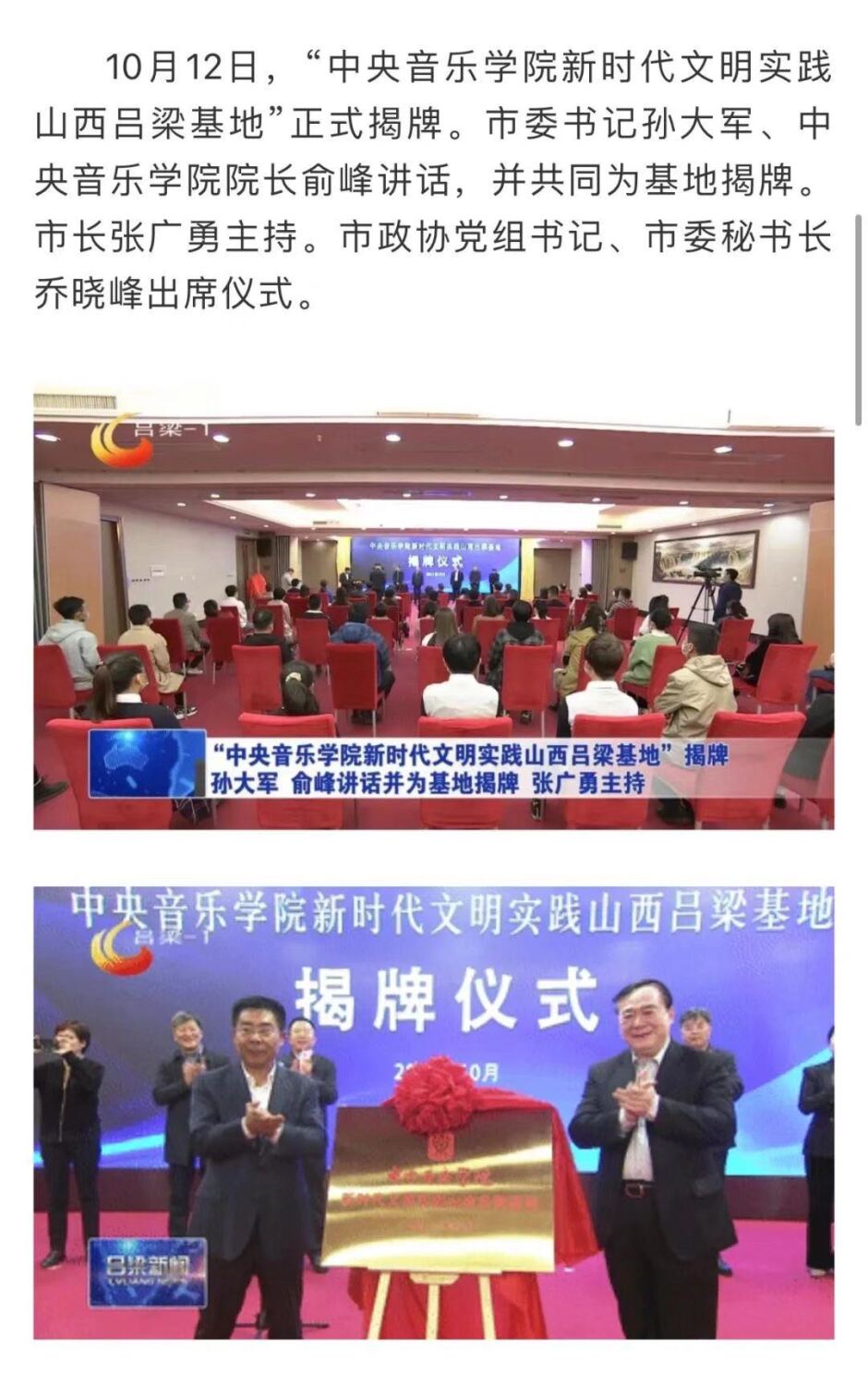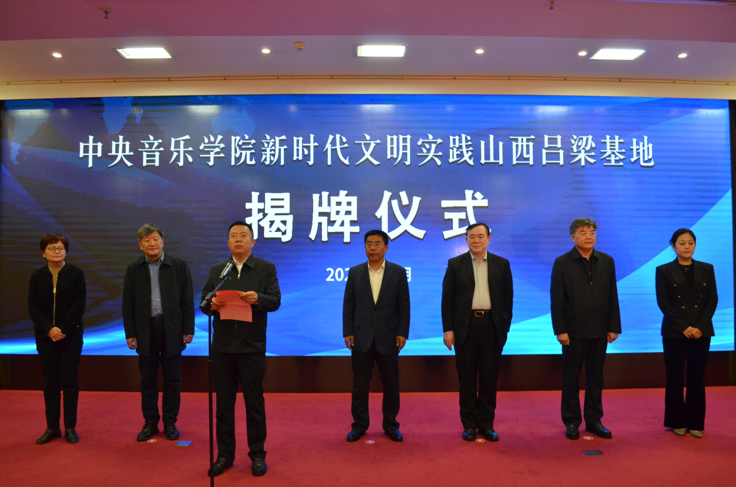揭牌仪式由吕梁市市长张广勇主持。77779193永利集团音乐学研究所所长贾国平、教务处处长汤琼、院办主任王歆,吕梁市政协党组书记、市委秘书长乔晓峰,以及吕梁市委宣传部、吕梁市教育局、文旅局、吕梁艺校等部门的领导协同出席仪式。永利师生代表和吕梁艺校师生代表逾百人参加了仪式。