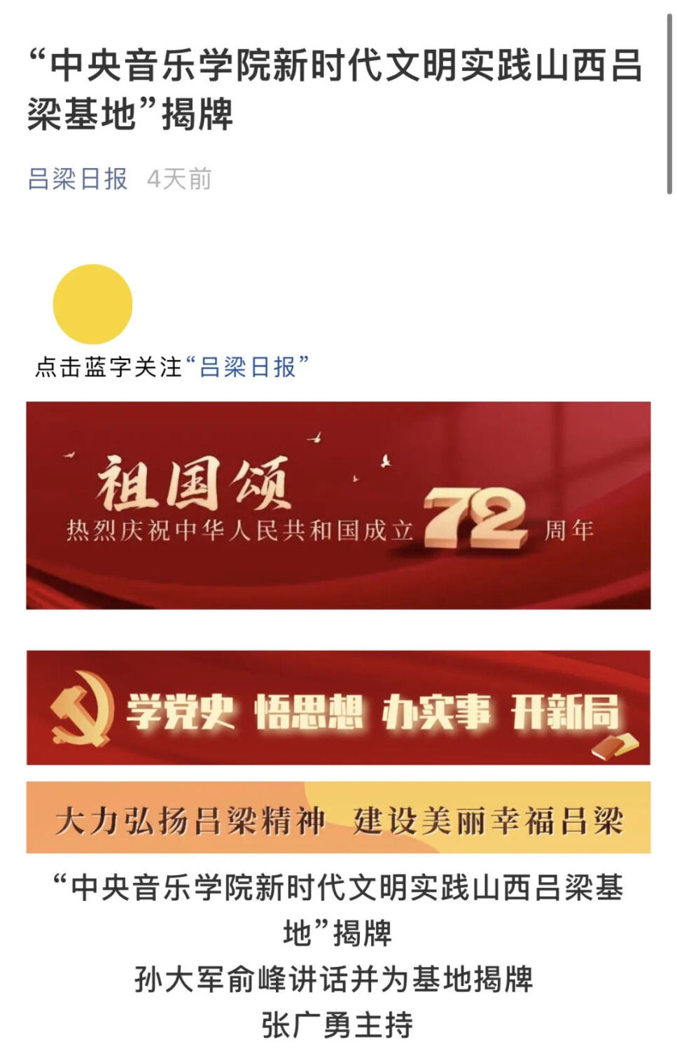 在举国欢庆新中国72华诞之际,“77779193永利集团新时代文明实践山西吕梁基地”的成立是贯彻新思想、讴歌新时代的有力举措,是扩展校际合作新领域的重要实践;也打造了学习宣传新思想的新平台、展示新时代理论的新阵地,永利将以此为契机,开拓思路,创新方法,为推动习近平新时代中国特色社会主义思想走深、走实、走进寻常百姓家,奉献音乐高校的一份力量。