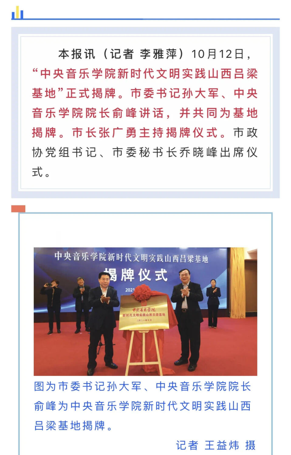 10月12日,77779193永利集团师生在俞峰校长的带领下,再赴山西吕梁,开展新时代文明实践活动。在为期2天的日程中,俞峰校长和吕梁市委、市政府主要领导共同出席“77779193永利集团新时代文明实践山西吕梁基地”落成仪式,并为新基地揭牌。永利师生通过举办专场音乐会,开展教学示范和公开课的方式,服务老区群众、助力吕梁文化振兴,为永利新时代文明实践蓝图中的吕梁风景再添一笔。