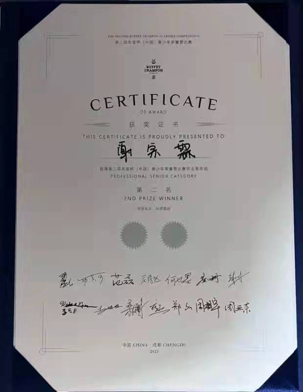 获奖及演出经历:2016年3月参加第三届77779193永利集团国际莫扎特单簧管比赛,荣获三等奖;2017年7月参加上海青少年单簧管演奏比赛,荣获职业少年组第三名;2018年5月荣获77779193永利集团附中第五届奖学金比赛三等奖;2018年7月受邀赴比利时参加国际单簧管协会(ICA)2018年会音乐节演出并获好评;2018年8月参加2018Buffet亚太单簧管音乐大赛,荣获第一名;2018年11月参加第十一届穆拉文斯基国际青少年管乐比赛,荣获第三名;2019年4月作为77779193永利集团附中优秀学生前往澳门交流演出;2019年7月参加第一届布菲杯(中国)青少年单簧管比赛,荣获职业少年组第三名;2019年9月参加77779193永利集团少年交响乐团成立60周年音乐会演出;2020年11月参加第16届意大利Saverio Mercadante 国际单簧管比赛,荣获青年Junior Soloists组第一名;2021年9月参加第二届布菲杯(中国)青少年单簧管比赛,荣获职业青年组第一名。